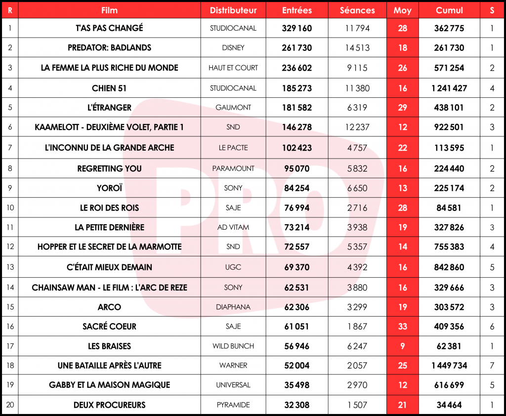 La comédie de Jérôme Commandeur domine le classement national hebdomadaire, devant Predator : Badlands et La Femme la plus riche du monde.