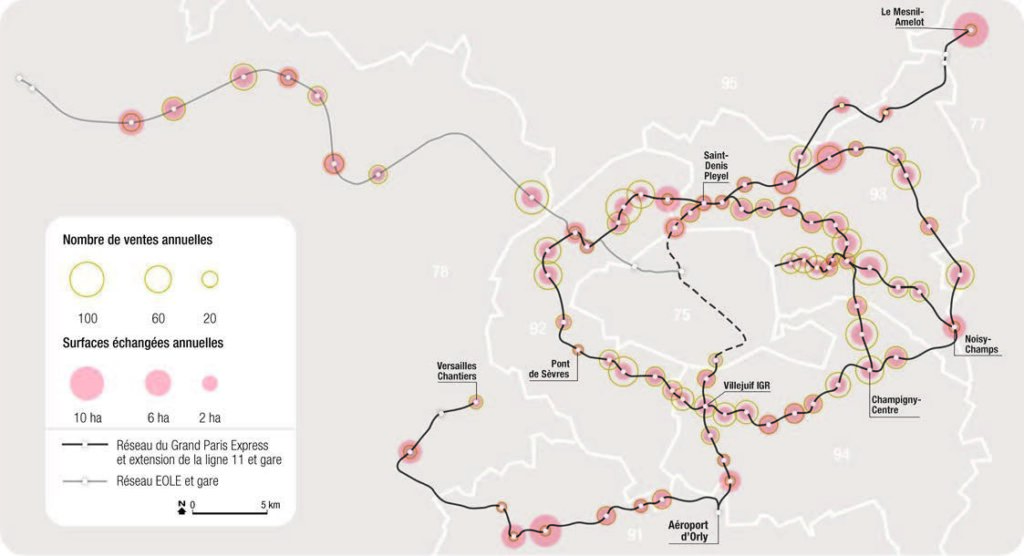 En moyenne, 2 800 ventes ont été enregistrées chaque année, en recul de 6 %. Les surfaces concernées atteignent 231 hectares, en retrait de 23%. Ces évolutions rabaissent les indicateurs aux niveaux de la période 2015-2017, après un pic entre 2018 et 2020 lié à l’effet d’annonce des nouvelles gares et au dynamisme des projets d’aménagement.
