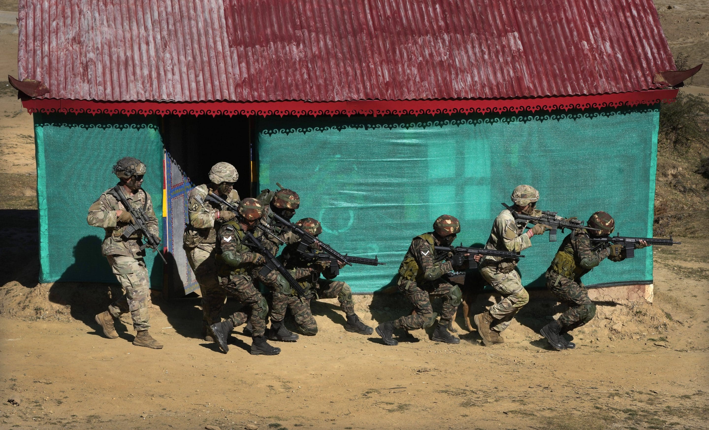 Soldats indiens et américains durant un exercice militaire commun en haute altitude. État de Uttarakhand, Inde, 2022. (C) SIPA