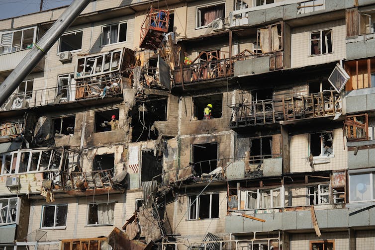 Des sauveteurs interviennent sur les lieux d’un bâtiment endommagé après une attaque russe à Kiev, en Ukraine, le 14 novembre 2025. La guerre contre l’Ukraine peut être qualifié comme totale, étant donné qu’elle englobe la guerre conventionnelle et la guerre hybride.