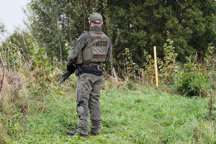 Un garde-frontière estonien patrouille la frontière russe près de Vinski, en Estonie, le 15 septembre 2025.