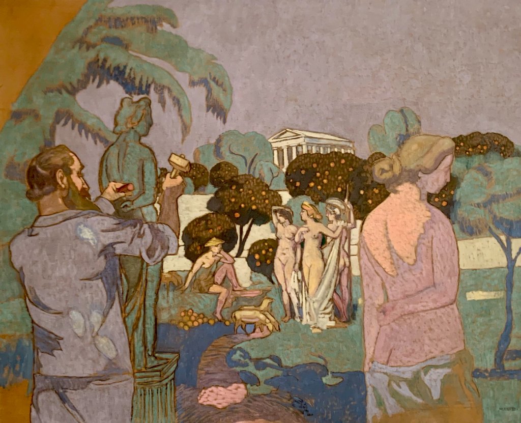 Il annonce cette future révolution ayant conduit à l’art abstrait ! Le mouvement Nabi auquel Maurice Denis appartient est plutôt de caractère intimiste, symboliste et décoratif. Il se réfère à la tradition classique dans ses citations et sa forme. Fervent catholique, le peintre met l’art au service de sa foi. Sa peinture si parfaite dans sa facture, à la palette de couleurs si séduisantes, si totalement charmante dans son ensemble est d’un goût « parfait » pour plaire à la bourgeoisie de l’époque. Il manquerait à nos yeux d’observateur du XXIe siècle qu’une spontanéité et une folie créatrice que l’on vit éclore après la Première guerre mondiale. On ne retrouve pas cette étincelle dans l’œuvre de Maurice Denis. Cependant nous nous plaisons fort à admirer l’art avec lequel sa palette se fond dans les bleus, les roses et les vert véronèse qui créent de la sérénité dans ses paysages idylliques.