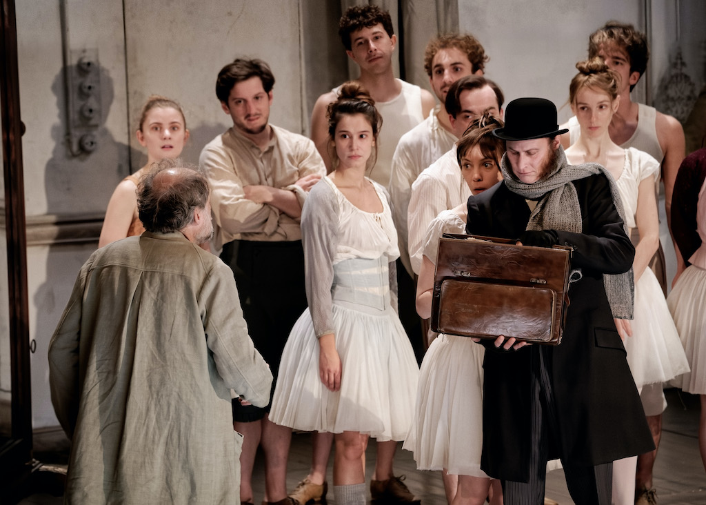 A Florence, au XVIII° siècle, Monsieur Rigadon, maitre de danse tyrannique et près de ses sous, garde sous sa coupe une flopée de jeunes danseurs qu’il martyrise à coups d’insultes et de cris de colère. De temps en temps se présentent à lui des impresarios ou intermédiaires véreux qui lui « achètent » une danseuse pour la faire tourner dans des spectacles. Mais les affaires vont mal et le vieil homme, pour nourrir ses jeunes recrues et renflouer la maisonnée, lui-même vivant avec sa propre soeur, une vieille fille fantasque, doit accepter qu’une mère désespérée lui confie sa fille prodige, Rosina, afin de pouvoir signer des contrats juteux. Clément Hervieu-Léger a choisi d’utiliser le décor de son « Misanthrope » et a transformé les contraintes techniques en opportunité artistique. Le studio de danse est ainsi une grande pièce en sous-sol, que la lumière de la ville transperce grâce à de hautes fenêtres qui donnent sur la chaussée. La patine de poudre grise des murs, l’escalier de bois qui mène à la rue, les tutus de tulle blanche portés sur des corsets chair des jeunes danseuses, tout rappelle les tableaux de Degas et le mélange de sublime et de misère qui se dégage de ses portraits de danseuses dans le foyer de l’Opéra au 19° siècle.