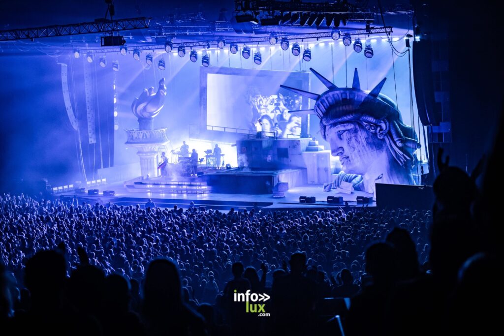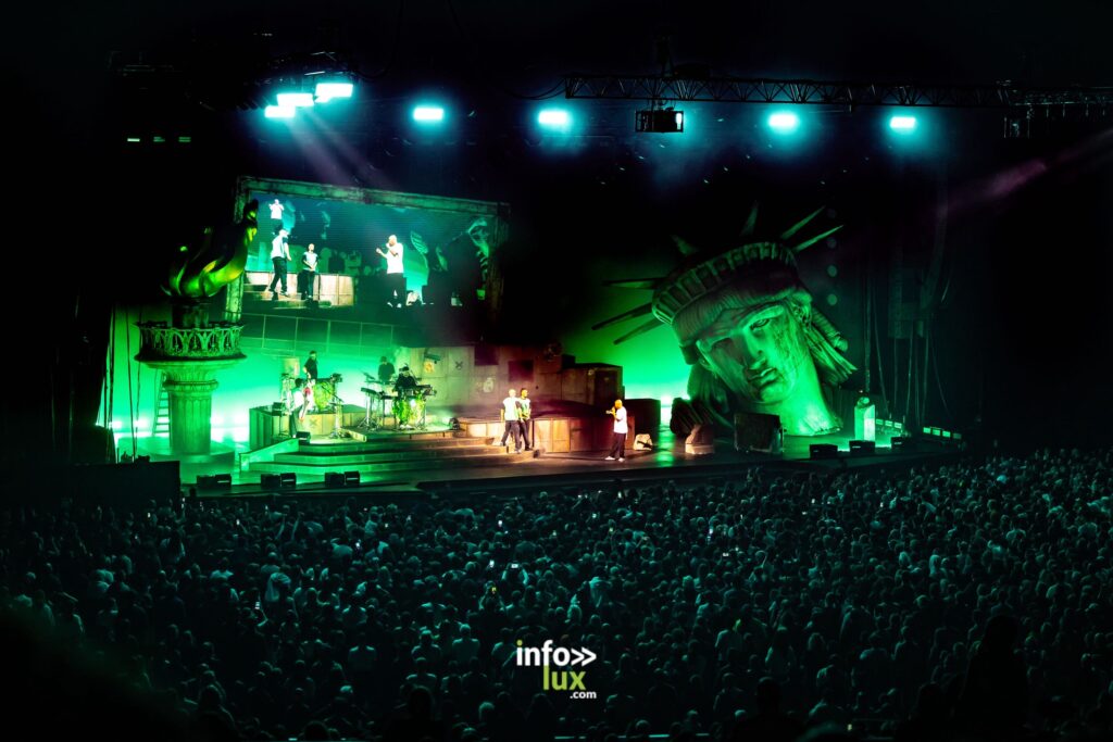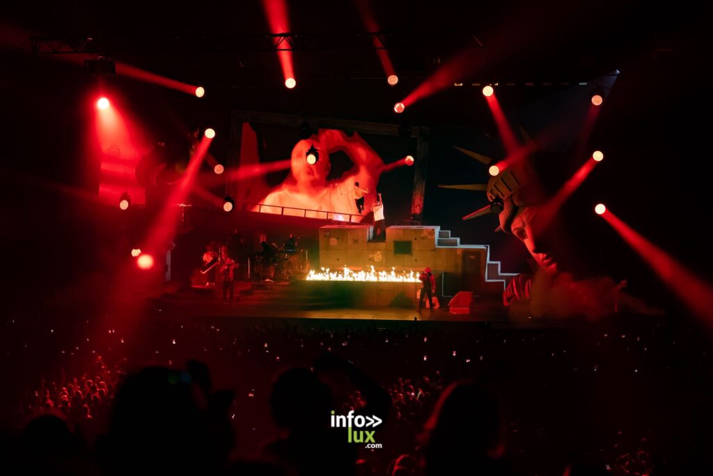 Le public est plongé dans un univers urbain entre rêve américain, terrain de jeu géant et ambiance post-apo très stylisée. Les jeux de lumière, eux, sont d’une richesse spectaculaire : flashs, poursuites, projections massives et nuages de fumée enveloppent constamment la scène.