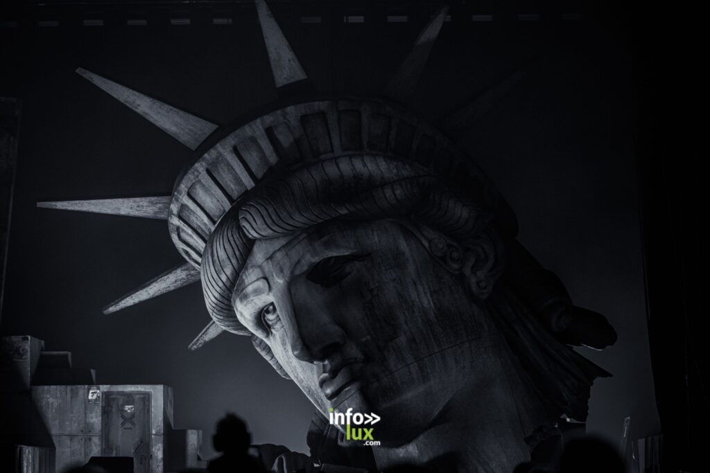 Dès les premières secondes, la scénographie frappe de plein fouet. Les photos parlent d’elles-mêmes : une gigantesque tête de Statue de la Liberté effondrée sur le côté, une reproduction monumentale de sa torche, des blocs de scène façon métropole en ruine… Le décor est colossal, immersif, presque théâtral.