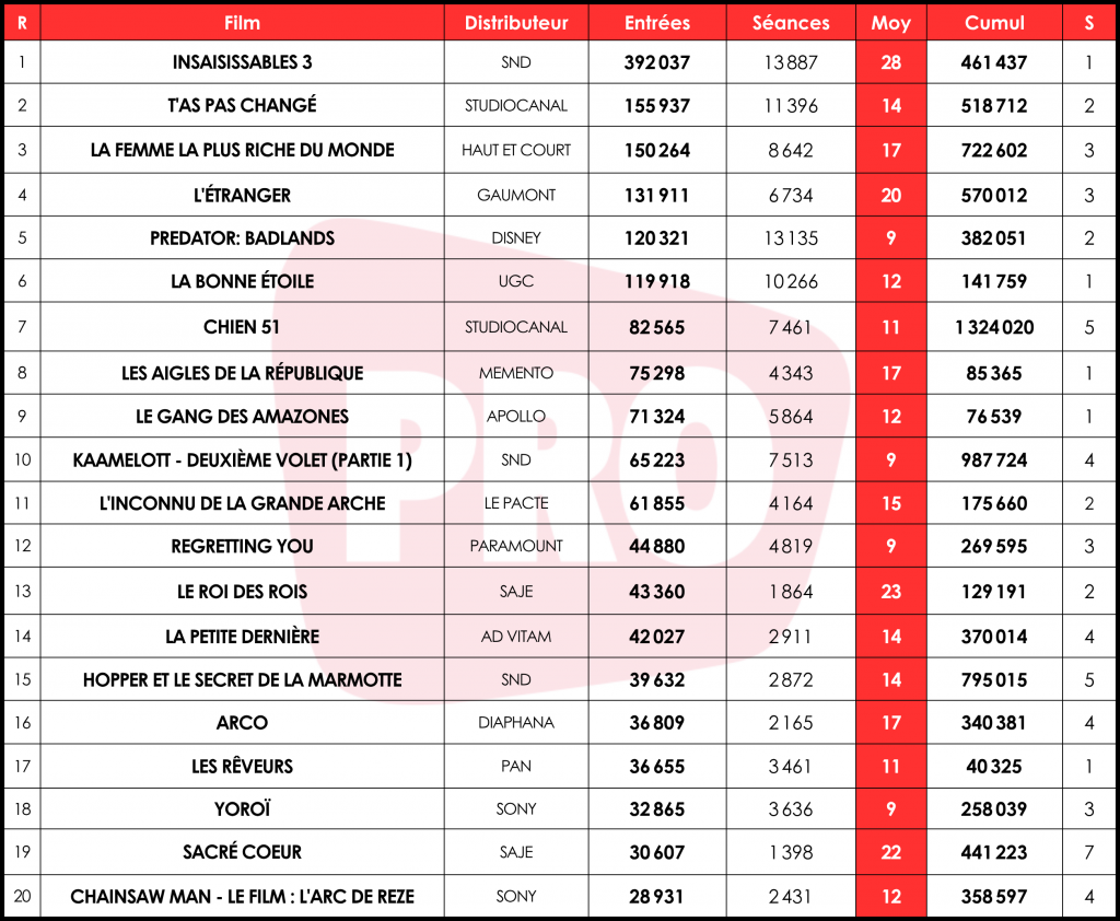 392 000 curieux sont allés découvrir les nouvelles aventures des Cavaliers dans Insaisissables 3, soit une moyenne de 28 entrées par séance (e/s). Un démarrage largement supérieur à ceux d’autres opus d’une franchise tout aussi mystique, S.O.S. Fantômes : en 2024, La Menace de glace s’élançait à 266 000 billets (17 e/s) pour un cumul final à 957 000 entrées, tandis qu’en 2021, L’Héritage écoulait 253 000 tickets (17 e/s) pour finir à 620 000 entrées.