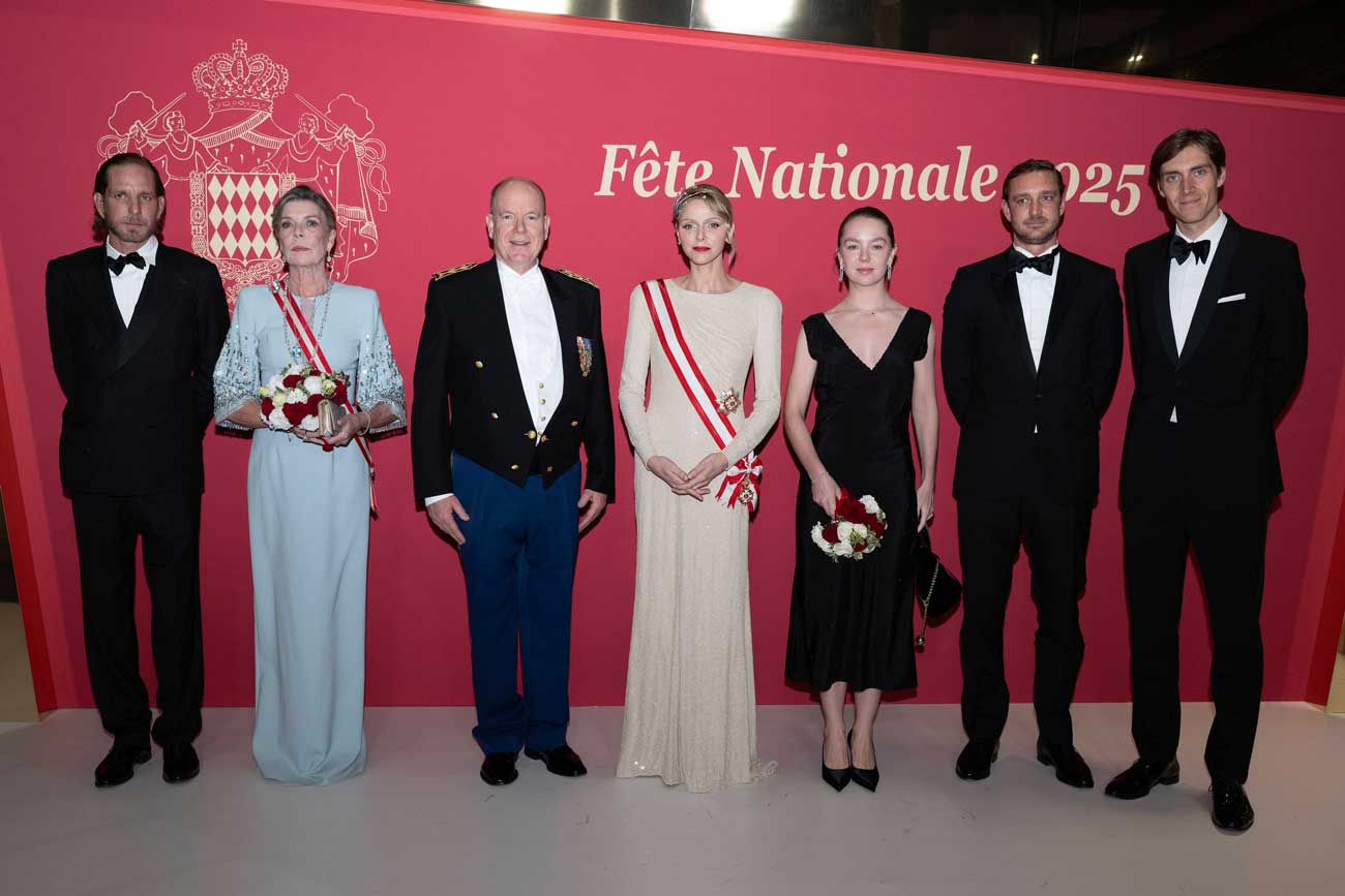 Andrea Casiraghi, la princesse Caroline de Hanovre, le prince Albert II, la princesse Charlène, la princesse Alexandra de Hanovre, Pierre Casiraghi et Ben-Sylvester Strautman à la soirée de gala de la fête nationale 2025 (Photo : David Nivière/SIPA)