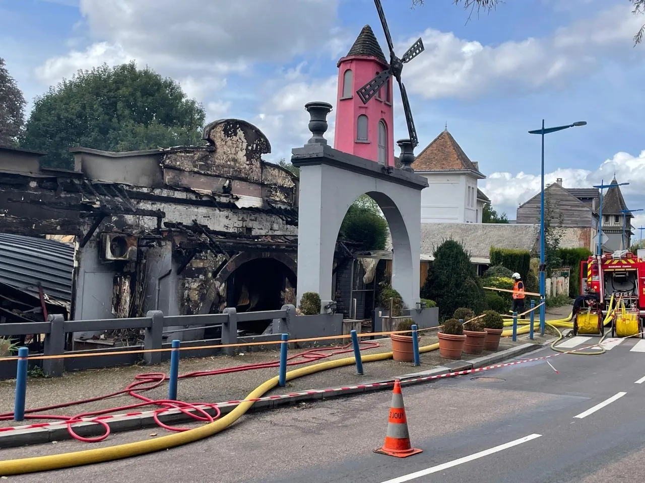 Le Moulin rose, discothèque centenaire de Belbeuf (Seine-Maritime), a été en grande partie détruit par un incendie d’origine criminelle, dans la nuit du 16 septembre 2025. © Ouest-France