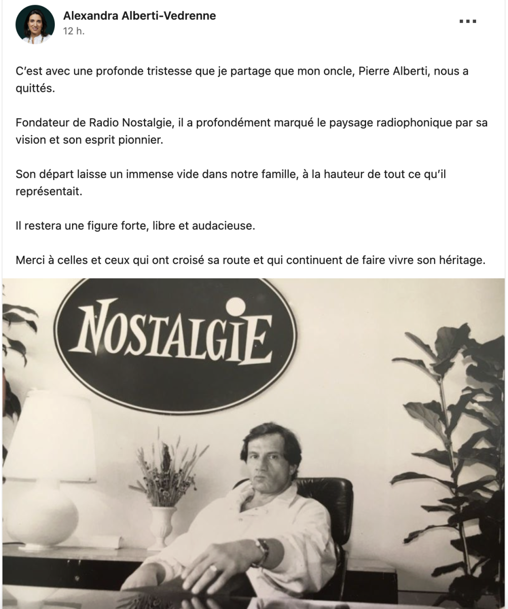 « C’est avec une profonde tristesse que je partage que mon oncle, Pierre Alberti, nous a quittés. Fondateur de Radio Nostalgie, il a profondément marqué le paysage radiophonique par sa vision et son esprit pionnier », écrit-elle.