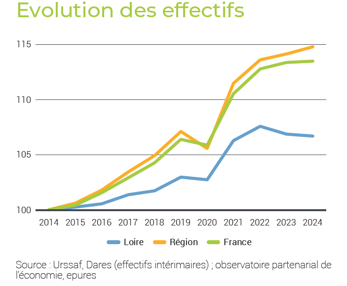 Entre 2014 et 2024, le secteur a gagné 2 010 salariés dans le département. Les effectifs salariés ont fortement diminué entre 2014 et 2016 avec la perte de 380 postes. En revanche, entre 2017 et 2019, ils ont augmenté avec la création de 1 400 postes. En 2020, en raison de la crise sanitaire, l’industrie a perdu 380 postes mais depuis 2021, elle gagne 1 370 effectifs salariés. Les effectifs sont stables depuis l’année dernière. Après celle de la fin des 30 Glorieuses, la dernière grande « saignée » industrielle date davantage de la fin des années 1990 aux années 2000 (36,3 % de l’emploi privé ligérien en 1998 ; 25,5 % en 2014). La création d’établissements progresse nettement : de + 13,5 %.