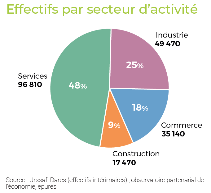 Avec une baisse d’effectifs salariés de 4,9 %, le conseil est le secteur qui perd le plus d’emplois entre 2023 et 2024 (- 410). En revanche, plusieurs secteurs progressent fortement, comme l’intérim (+ 340 postes), les hôtels et restaurants (+ 250 postes), les services aux entreprises et la santé et action sociale (+ 210 postes chacun sur un an).