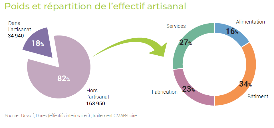 Dans la Loire ses effectifs sont à 27 % services, 16 % alimentation, 23 % fabrication, 34 % bâtiment. Le bâtiment enregistre une baisse des effectifs de 1,2 % entre 2023 et 2024 (- 130 postes). En revanche, le secteur de la fabrication connaît une hausse de ses effectifs de 1,6 % (+ 110 postes), tout comme le secteur de l’alimentation (+ 70 postes) et des services (+ 1,8 % de ses effectifs, soit 140 postes). Si le Roannais perd dans l’artisanat 2,4 % de ses effectifs, Loire Forez et Saint-Etienne Métropole les augmentent (+0,3 et + 0,7 %), Forez Est surtout avec + 3,7 %.