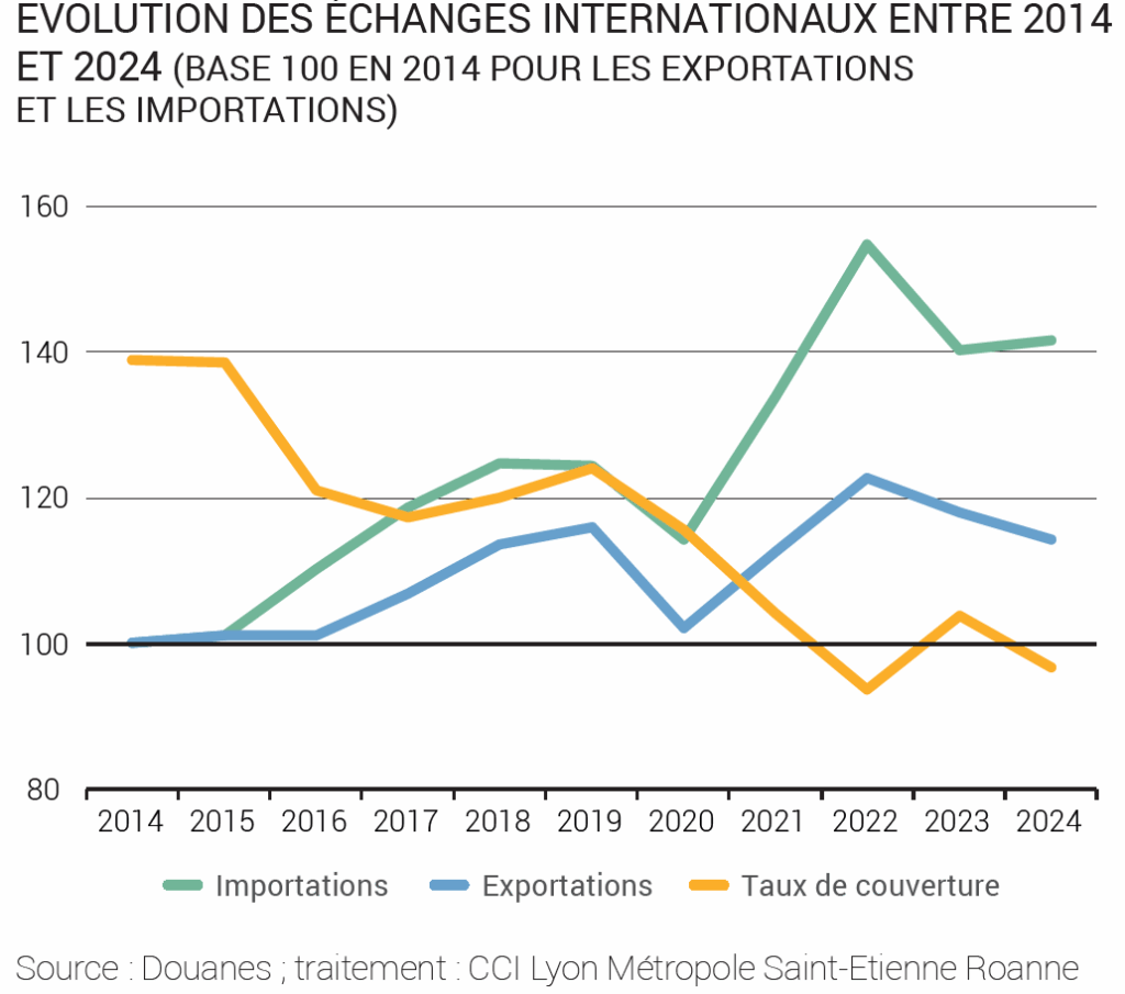 En 2023, ce déficit s’était fortement réduit puisqu’il s’est élevé à – 380 M€ : 4,32 Md€ exportés pour 4,7 importés Md€ (92 % de taux de couverture, + 5,2 %). Car le recul des échanges dans les deux sens a été plus marqué sur les importations (-9,4 %) que les exportations (- 4 %). Hélas, le déficit est reparti dans le mauvais sens en 2024. La balance commercialede la Loire est déficitaire en 2024 (- 551 Md€) avec un taux de couverture de 88,4 % (- 3,6 points sur un an). Cette année, les exportations diminuent de 3 % par rapport à 2023, pour une valeur totale de biens échangés de 4,2 Md€. Simultanément, les importations progressent légèrement (+ 0,9 %) pour un cumul de 4,8 Md€. En Auvergne-Rhône-Alpes, les importations, d’un montant de 76,1 Md€, baissent de 2,1 %. Les exportations reculent de 0,8 % pour atteindre 71,4 Md€.