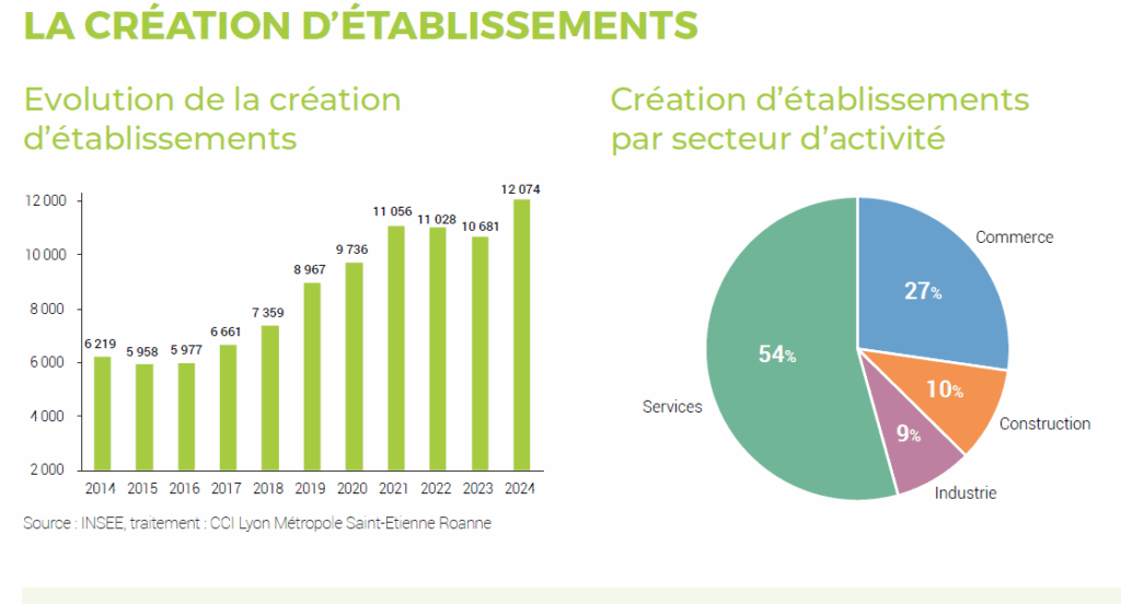 L’artisanat a son focus isolé puisque « trans secteurs » défini comme les entreprises de moins de 11 salariés. Il fournissait en 2024 34 940, soit 18 % des emplois salariés privés dans la Loire contre 17,4 % en 2023, soit 34 680 postes* comme indiqué l’an passé ! Quatrième année consécutive de hausse dans la Loire… La progression est cette année de + 0,8 % d’emplois (mais un recul, de 0,5 % 1er semestre 2025 vs 1er semestre 2024). Le nombre d’établissements, lui, est en hausse de 11,9 %, passant de 20 280 en 2023 (alors en recul de 4,3 %) à 22 700 en 2024. De quoi reprendre le fil d’une tendance de fond : + 58 % en 10 ans !