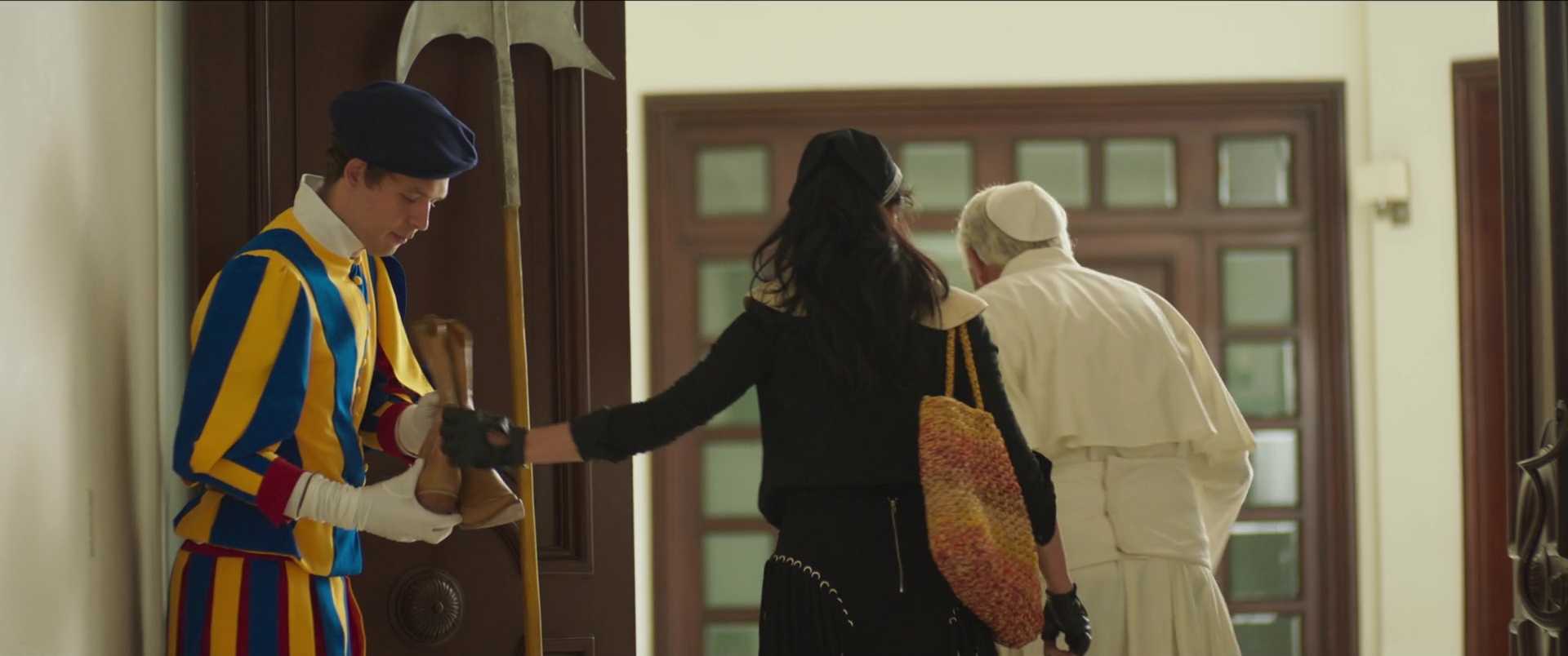 On devine l’idée quelque part de faire de la Papamobile un genre de voiture de James Bond, avec un assortiment de gadgets parodiques en mode bondieuseries bling-bling, mais si cela a existé sur le papier, ce n’est pas arrivé jusqu’au film.
