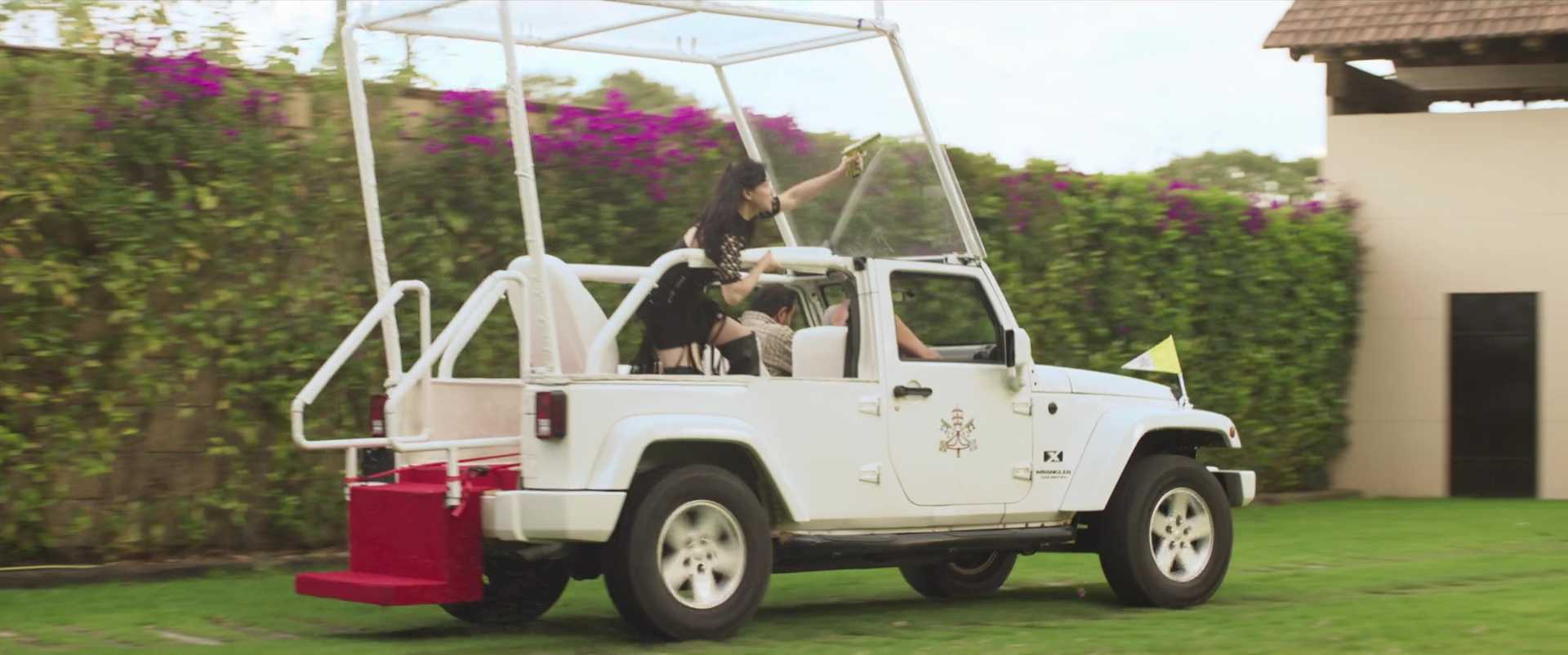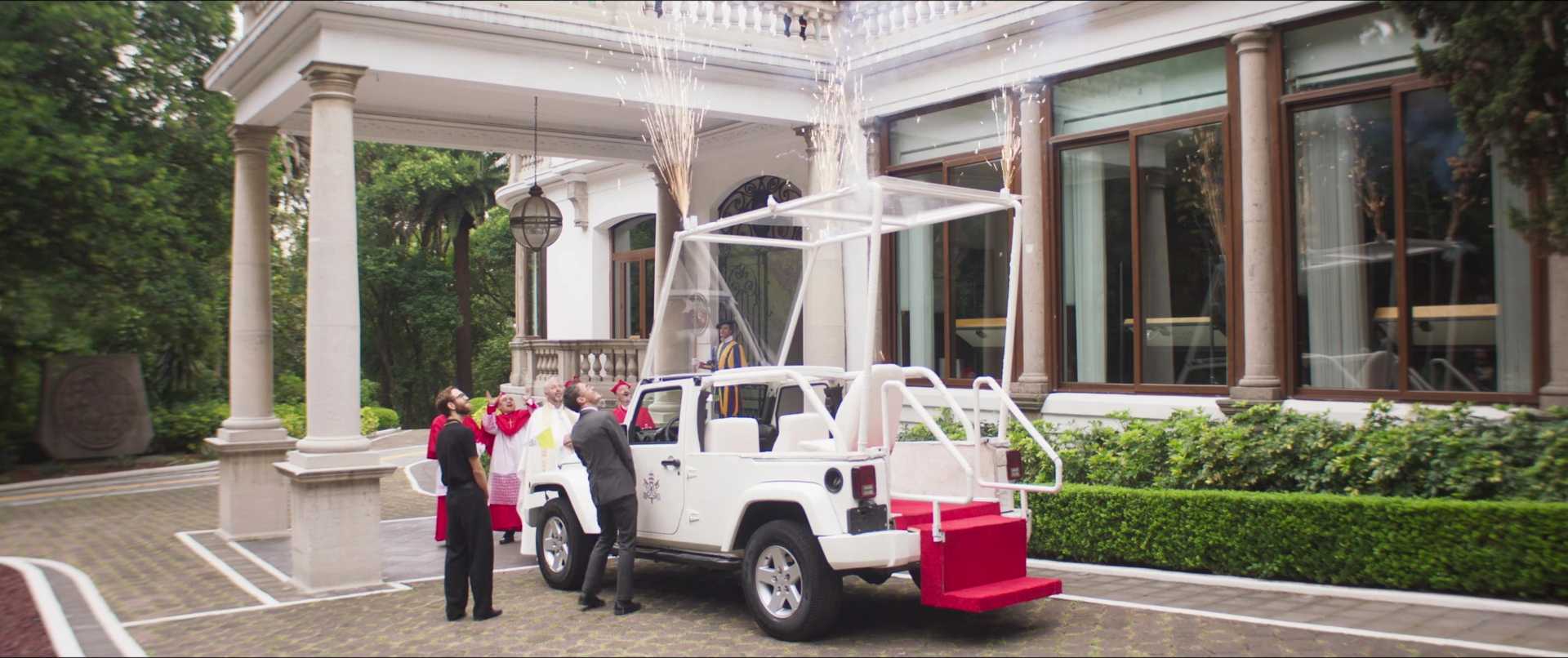 On devine l’idée quelque part de faire de la Papamobile un genre de voiture de James Bond, avec un assortiment de gadgets parodiques en mode bondieuseries bling-bling, mais si cela a existé sur le papier, ce n’est pas arrivé jusqu’au film.