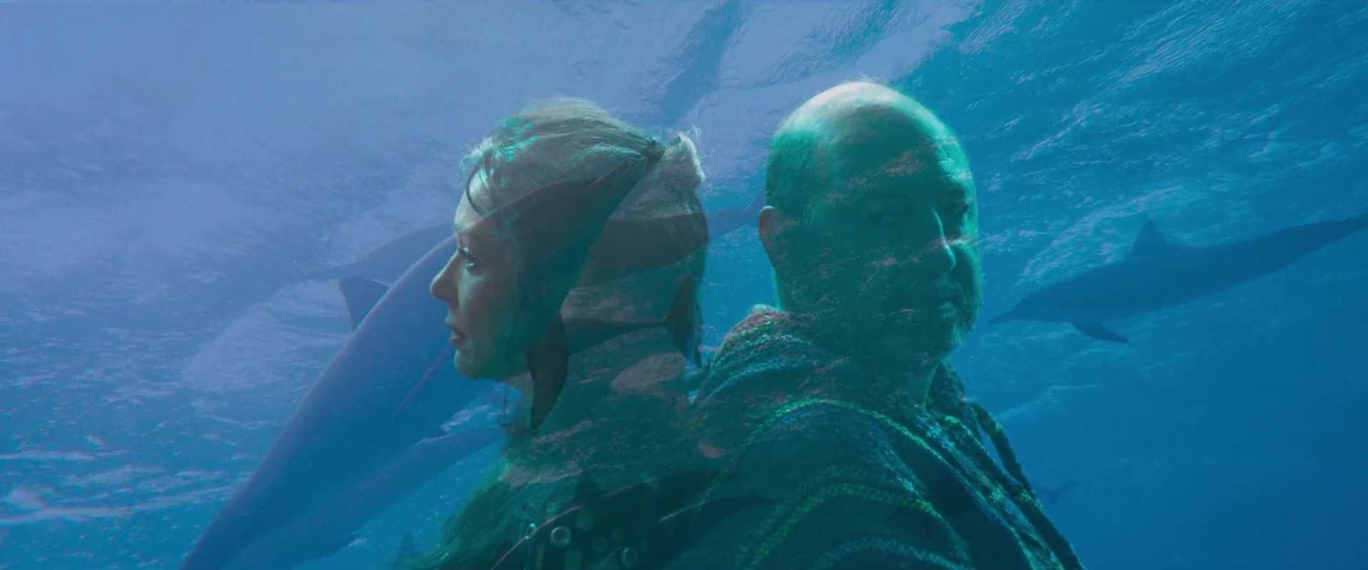 Un autre procédé auquel Papamobile a recours et qui semble aussi avoir été une béquille tardive, c’est de basculer occasionnellement dans un style irréel ou onirique pour s’épargner des transitions qu’il n’avait pas. Par exemple, vers le milieu du film, Slim, Françoise et la Papamobile doivent rentrer du Mexique en Italie – il est essentiel pour l’histoire que la voiture revienne avec eux. Il n’aura échappé à personne qu’il y a un océan entre les deux pays. Le film avait sûrement une idée, mais on devine que celle-ci n’a pas pu être tournée ou ne fonctionnait pas. Finalement on a droit à une séquence incompréhensible où Kad Merad chante une espèce de chanson comique en incrustation sur des stock-shots de poissons qui nagent dans l’océan et hop ! plan d’après, on est en Italie avec la Papamobile. Tout juste Myriam Tekaïa lâche-t-elle en voix-off qu’elle a “un sous-marin” qui les attend (qui n’est jamais montré à l’écran).