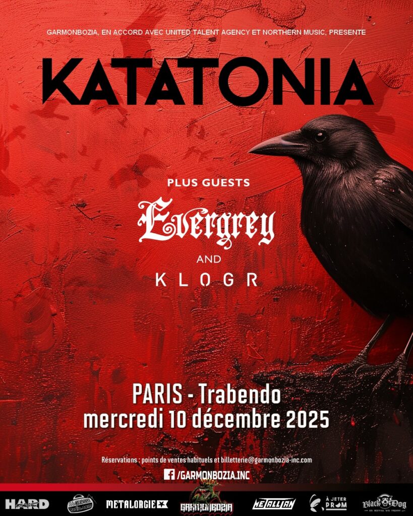 La présence d’Evergrey, pilier du metal progressif suédois, ajoute une dimension dramatique et émotionnelle supplémentaire à la soirée. Le groupe, connu pour ses atmosphères grandiloquentes et ses riffs ciselés, promet une montée en puissance idéale avant l’arrivée de Katatonia. KLOGR, formation italienne oscillant entre alternative metal et rock industriel, ouvrira quant à elle les portes d’un univers plus abrasif, parfait pour préparer le public à une nuit où la noirceur sera reine.