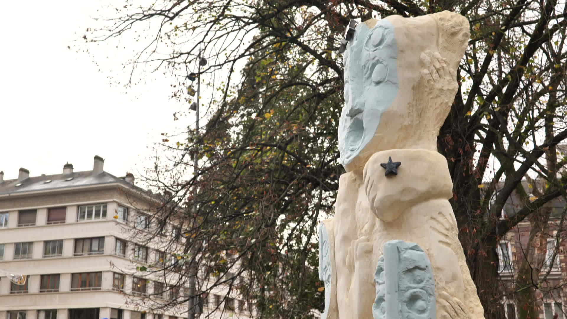 Une sculpture de deux mètres, ornée de multiples visages et parsemée d’empreintes de mains et de quelques étoiles. Un monument aussi colossal que le message qu’il délivre.