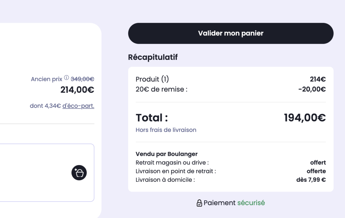 Chez Boulanger, le Mova M10 voit son prix s’effriter une fois ajouté au panier. Affiché à 215 euros juste avant le Black Friday, pour un prix initialement à 350 euros, il tombe à 194 euros grâce à une remise immédiate une fois dans le panier.