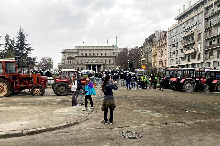 27 janvier – 11h30 : Des milliers d’étudiants ont commencé le blocage de l’immense rond-point d’Autokomanda, qui doit durer 24 heures. Des colonnes convergent depuis la place Slavija. Des convois d’agriculteurs en tracteurs convergent aussi vers Autokomanda, ainsi que des cortèges de motards. Sur place, des réserves d’eau et des toilettes mobiles ont été installées. La police détourne le trafic routier avant l’arrivée à Autokomanda.
