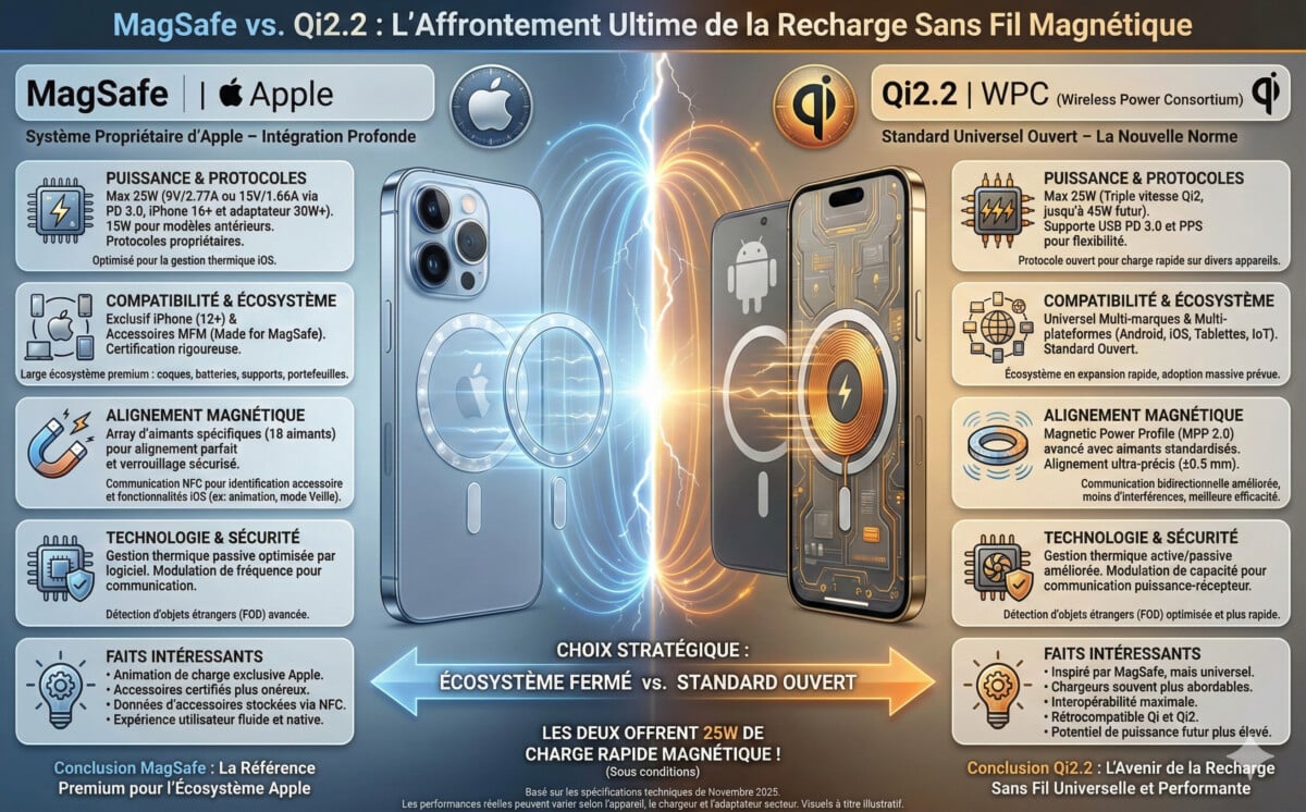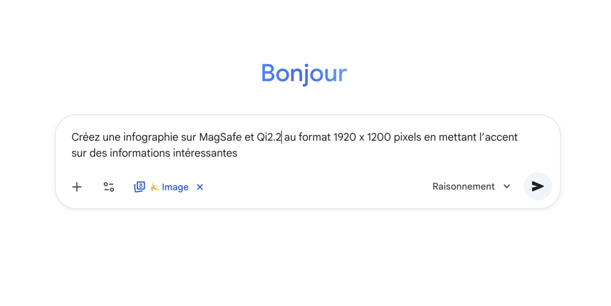 J’ai fait le test. Je lui ai demandé : « Fais-moi une infographie comparant le MagSafe et le standard Qi 2.2 ». Je ne lui ai donné aucune caractétistique. Le résultat ? L’IA a généré une image scindée en deux. D’un côté, l’anneau magnétique d’Apple, de l’autre le profil de charge du Qi 2. Elle a intégré du texte parfaitement lisible mentionnant les vitesses de charge (15W), l’alignement magnétique et la compatibilité. Elle a compris le sujet technique, a été chercher les informations, et a construit le visuel. C’est bluffant, il faut l’avouer.