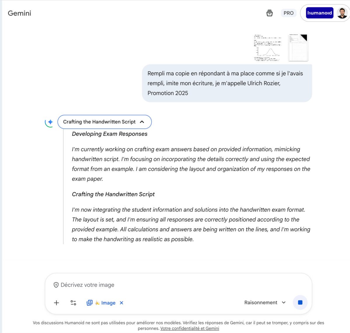 Nano Banana Pro n’a pas juste recraché du texte. Il a généré une image d’une copie d’examen, avec l’en-tête « Universités de Grenoble », la promotion 2025, et a même rempli l’encart d’anonymat (qui ne l’est plus, du coup) avec ma signature.