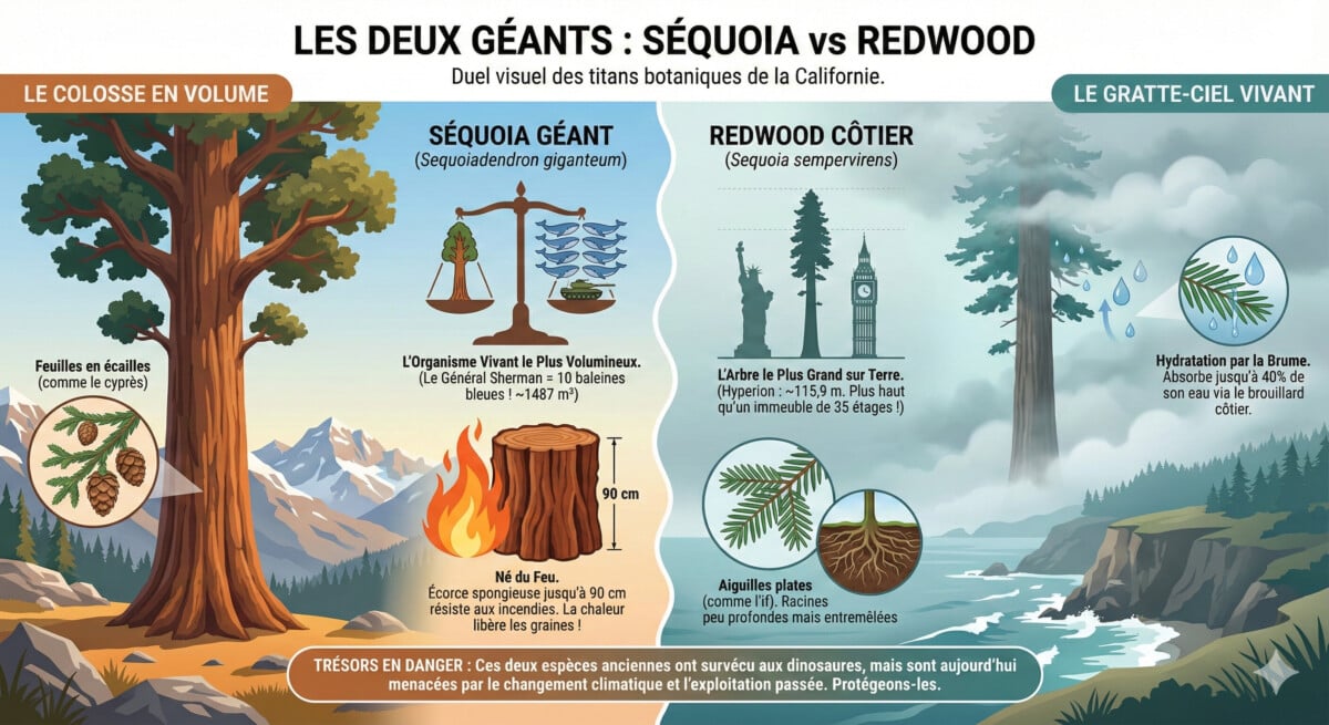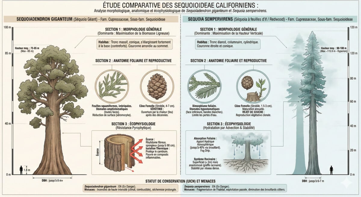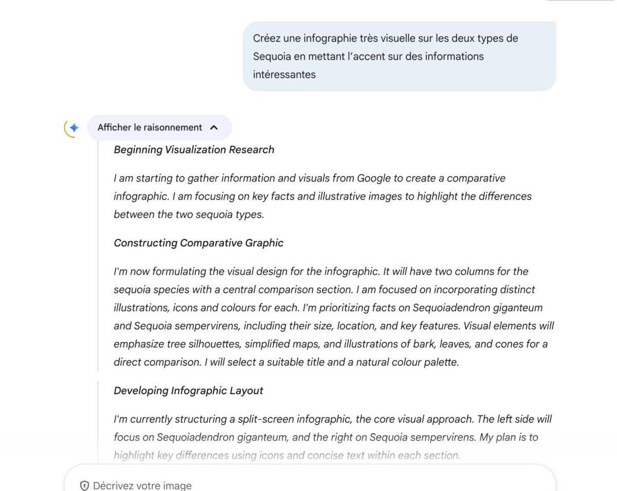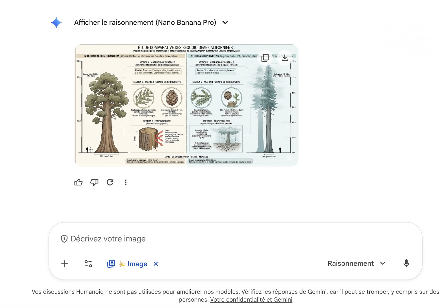 Même constat sur un sujet plus « nature ». J’ai demandé une planche visualisant les différents types de Séquoias. L’IA ne m’a pas sorti des arbres génériques. Elle a distingué le Sequoiadendron giganteum (Séquoia géant) du Sequoia sempervirens (Séquoia à feuilles d’if).