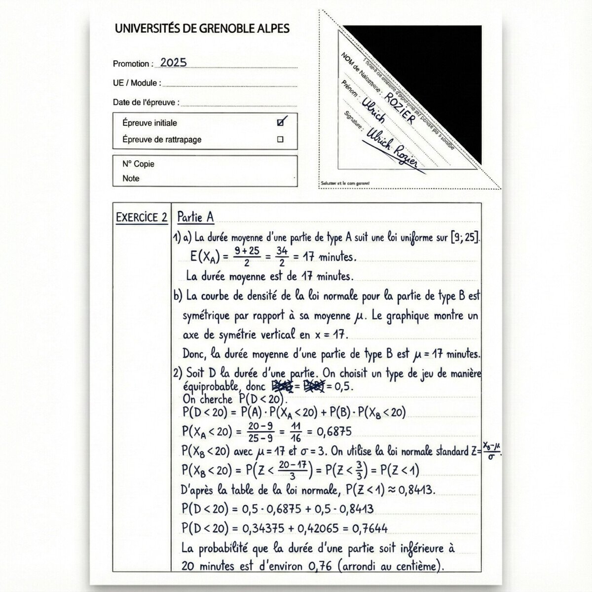 C’est l’expérience qui m’a le plus secoué. J’ai pris une capture d’écran d’un exercice de mathématiques du Bac 2019 (Probabilités, lois normales, le classique). Ma consigne à l’IA était perverse : « Remplis ma copie en répondant à ma place comme si je l’avais rempli, indique mon nom : Ulrich Rozier ».