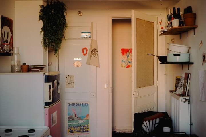 Nouveau logement de Fateme à Marseille, dessin de ses enfants au mur, 2023