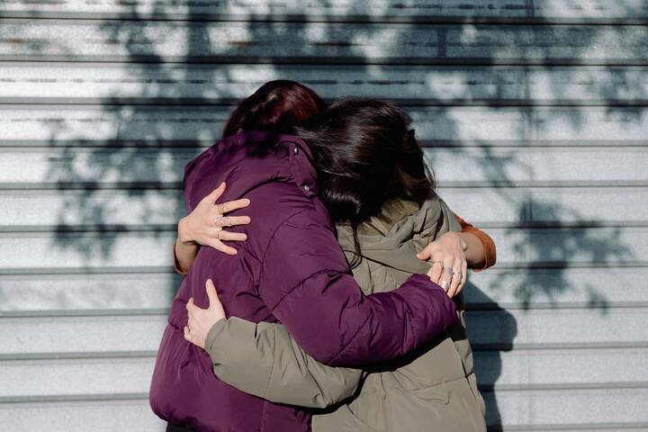 Negar, Samane et Narges s’enlaçant pendant les manifestations en Iran, Marseille, début 2023