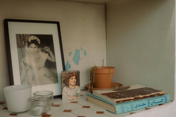 Objets apportés d’Iran par Anahita : photos de famille et poésie — © Tina Masoumi