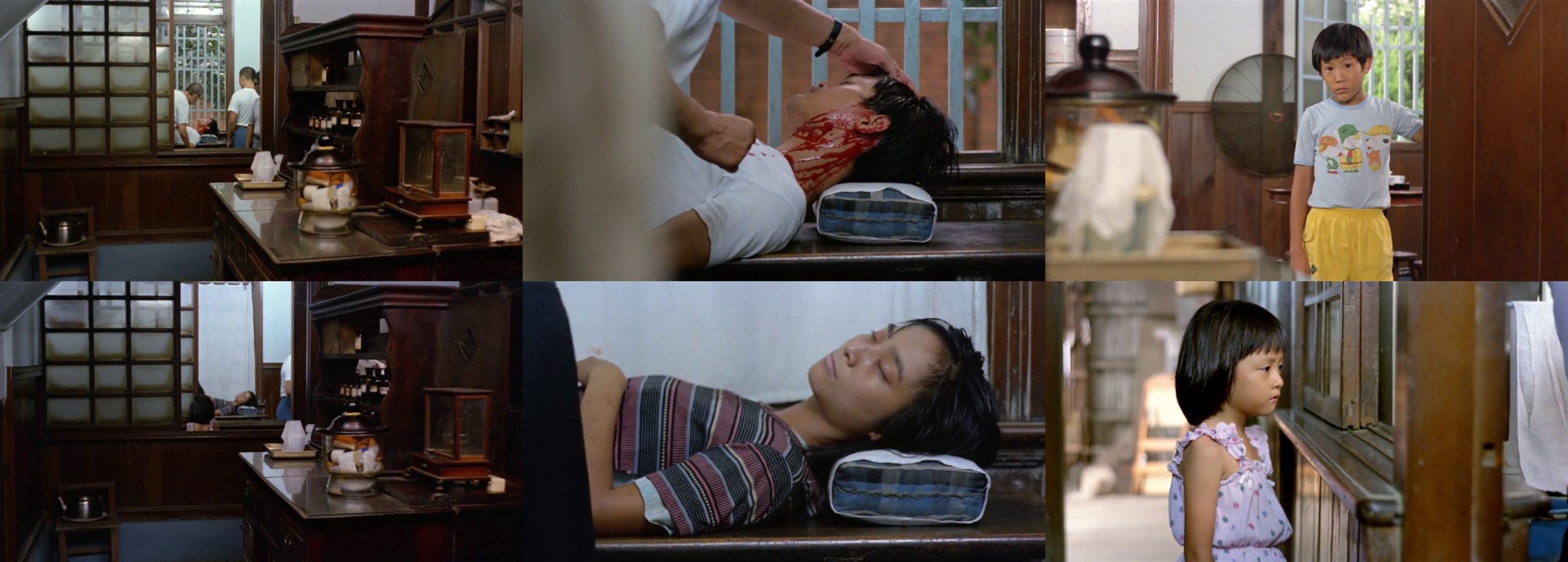 L’alliance du plan large et du gros plan devient ici un moyen de figurer la manière dont une image traumatique s’imprime et persiste dans la mémoire d’un enfant. Cette idée se cristallise dans deux séquences construites selon un découpage presque identique : dans la première, Dong-Dong découvre un homme à la tête ensanglantée ; dans la seconde, Ting-Ting aperçoit le visage d’une femme inconsciente après avoir chuté d’un arbre. Le premier plan de chaque séquence est structuré par un jeu de surcadrages grâce auquel le visage de la victime apparaît emboîté dans la profondeur de champ. Réutilisé tout au long du film pour embrasser le point de vue partiel des personnages, le surcadrage devient ici presque excessif, pour matérialiser à la fois une distance physique et temporelle. L’image, reléguée au fond du cadre, agit comme une réminiscence traumatique : un souvenir que les expériences ultérieures ont peu à peu recouvert sans jamais parvenir à l’effacer. Les deux plans suivants, montés en champ-contrechamp entre la victime et l’enfant, traduisent alors la manière dont cette vision distante s’est imposée à leur regard avec la force d’un gros plan – révélant le saisissement brutal d’une perception d’enfant confrontée à la violence du réel.
