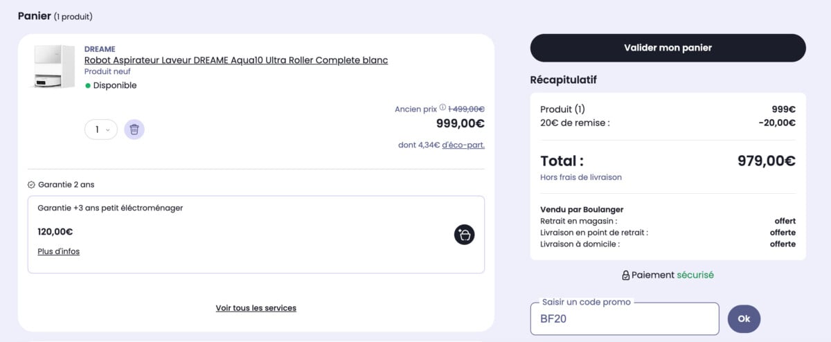 Lancé à 1 499 euros, puis réduit à 999 euros, le Dreame Aqua10 Ultra Roller Complete peut aujourd’hui vous revenir à 979 euros chez Boulanger grâce au code promo BF20 valable jusqu’au 27 novembre 2025 à 9h.