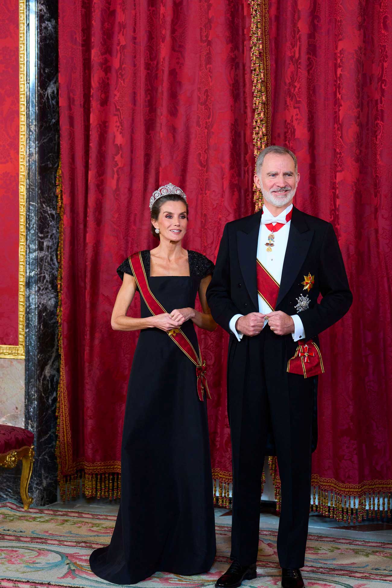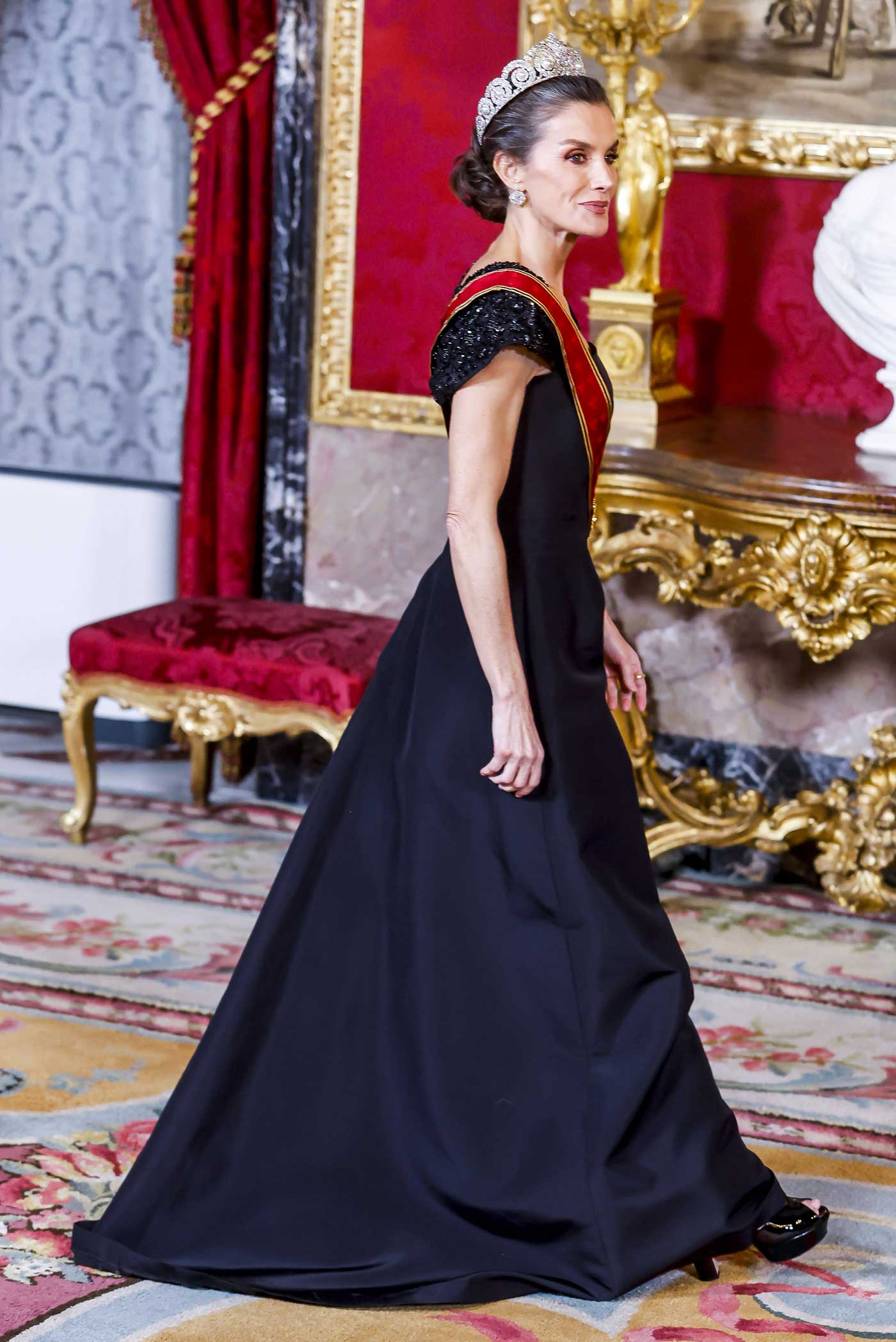 La reine Letizia portait une robe noire assez sobre, ornée de strass aux épaules. C’est surtout son magnifique diadème qui attirait l’attention. La reine Letizia ne porte pas de diadème à tous les banquets d’État mais elle semble reprendre l’habitude d’en porter plus fréquemment qu’au début du règne de son époux. Le diadème choisi ce mercredi a longtemps été porté par sa belle-mère, la reine Sofia, et depuis l’accession au trône de Felipe, en 2014, la reine Letizia l’a très peu porté.