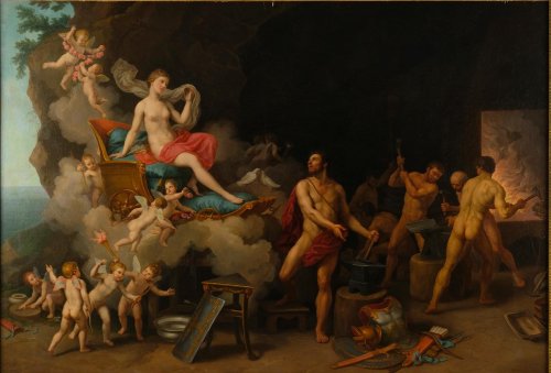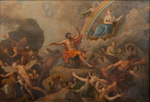 Peinte en 1804, cette toile de grand format permet d’évoquer les dernières années de Pécheux. Elle représente l’Air, incarné par Éole, que vient trouver Junon pleine de rancœur et de colère contre Énée. Ainsi commence le récit de l’Énéide : la flotte du héros troyen approchait de l’Italie, au grand dam de la déesse qui, accompagnée de la belle Déiopée, sut convaincre le dieu des vents de provoquer une effroyable tempête.
