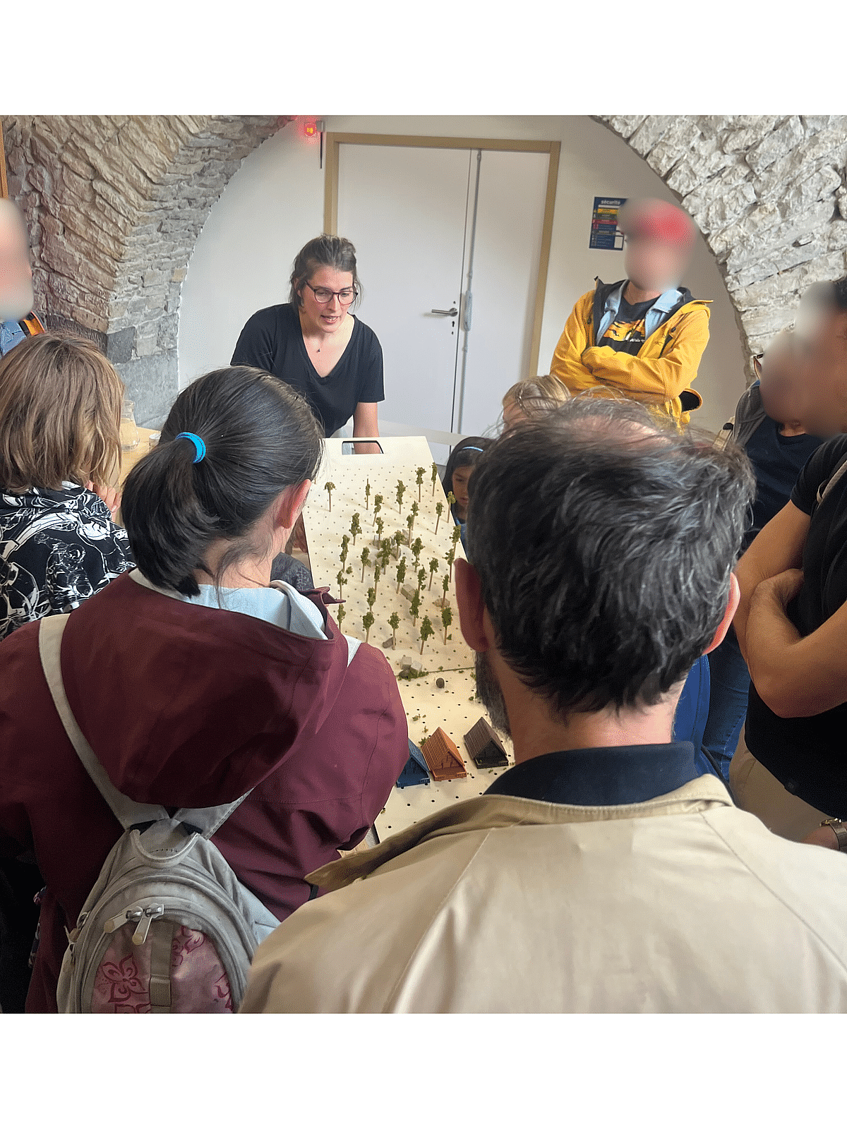 Réalisée par le Laboratoire des Écosystèmes et Sociétés en Montagne (LESSEM) d’INRAE, cette maquette illustre de manière simple la façon dont les forêts limitent les risques liés aux chutes de pierres. Sur un plan incliné, de petits arbres factices représentent une forêt. En haut du dispositif, des cailloux sont lâchés : lorsque la forêt est présente, ils  ralentissent et parfois s’arrêtent ; sans forêt, ils dévalent la pente jusqu’en bas et impactent les maisons. Une démonstration visuelle, immédiate et efficace de la fonction protectrice des écosystèmes forestiers.