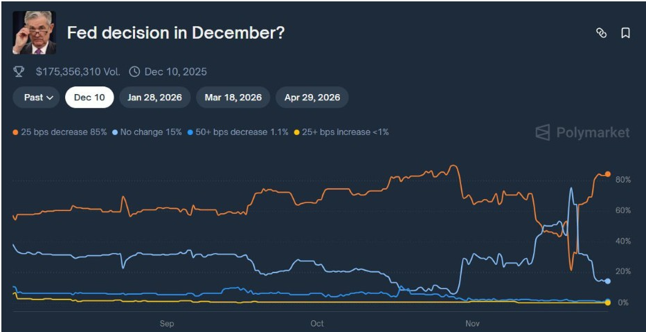 Les données de Polymarket indiquent une tendance similaire. Les probabilités d’une réduction du BPS le 25 décembre ont atteint des niveaux proches de 85 %, ce qui constitue la valeur la plus élevée à ce jour. La probabilité d’un statu quo s’est glissée dans la fourchette basse des 10 %, tandis que la probabilité d’une baisse plus importante est restée très faible. Ce changement est intervenu après une semaine volatile dans l’actualité cryptographique, au cours de laquelle les contrats de baisse de taux ont oscillé avant de se stabiliser à des niveaux proches des sommets actuels.