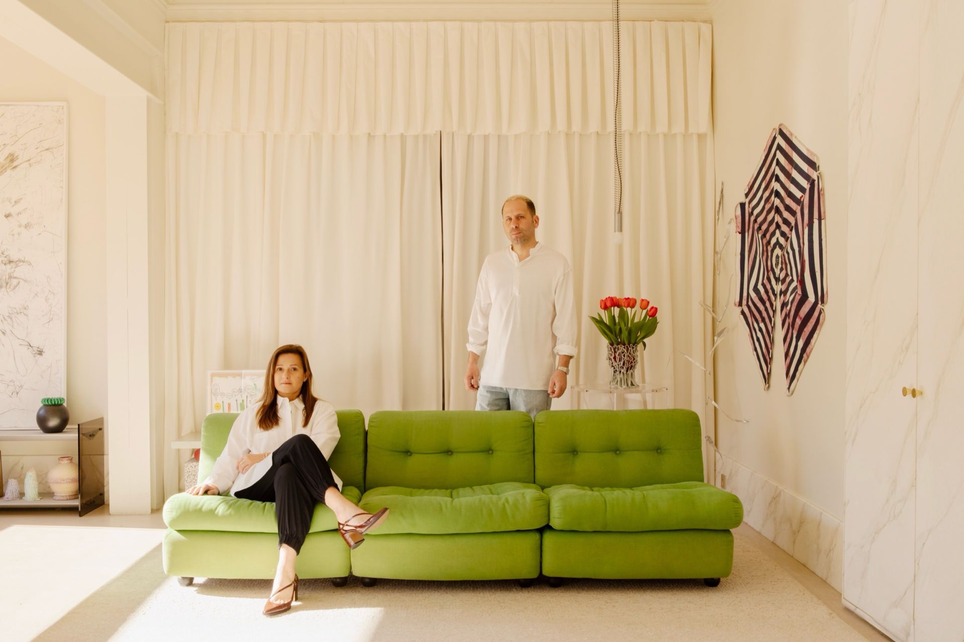 C’est désormais à la Pointe-Rouge, à proximité de la mer, que vit en famille l’architecte d’intérieur, avec son mari artiste Thomas, leurs deux filles et leur chien Pamela. Le couple a jeté son dévolu sur une maison de 90 m2, séduit par la lumière qui baigne le jardin. Une bâtisse à repenser entièrement : « Il fallait se projeter, mais c’est justement ce que j’aime dans mes projets », explique Marion. Son intervention permet de gommer les défauts de la maison. Elle commence par revoir la distribution, en déplaçant l’entrée pour qu’elle se fasse par le jardin, et non plus par la cuisine. Elle agrandit la pièce à vivre en empiétant sur l’espace extérieur, puis sacrifie une chambre pour donner l’accès à un étage qu’elle crée de toutes pièces, avec en prime un rooftop. « Thomas ne voulait pas de Placo dans cette maison. Pour l’extension, on a utilisé des carreaux de brique laissés bruts, les placards sont en MDF simplement huilés et, dans la salle de bains, les murs sont enduits à la chaux », détaille Marion. Sur le palier, trône un meuble signé Sottsass Associati pour Esprit. Dans la chambre, un lit chiné par Thomas fait face à un banc de Pierre Sala. Marion s’exprime également dans la pièce à vivre, qu’elle enrichit de multiples interventions. Pour y faire pénétrer la lumière, elle mise sur des fenêtres à guillotine. Afin de structurer l’espace, elle choisit d’ajouter un rideau : « La forme de cette pièce ne me plaisait pas parce qu’il y avait une porte d’un côté, et une autre qui menait à un couloir. J’ai eu l’idée de ce rideau qui théâtralise la pièce et en transforme le volume », explique-t-elle.