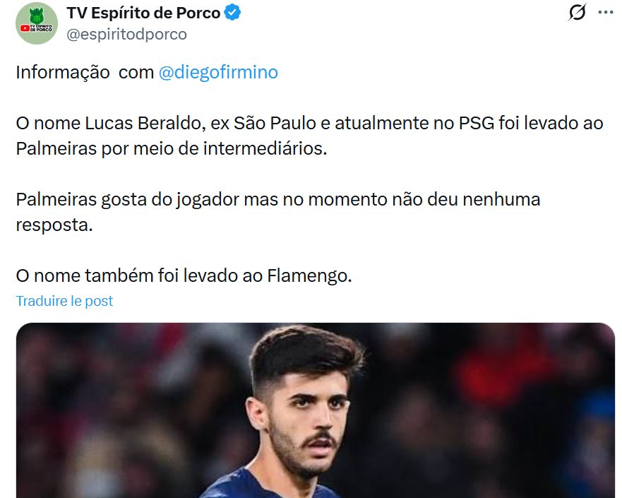 Lucas Beraldo, défenseur de 22 ans du Brésil, a su faire se faire une place, mais sans totalement s’imposer comme un titulaire rassurant des grands soirs depuis son arrivée au Paris Saint-Germain en janvier 2024 (contrat jusqu’en 2028). TV Espirito de Perco, via son journaliste Diego Firmino indique que des intermédiaires ont proposé le joueur à Palmeiras et Flamengo pour un possible retour au Brésil.