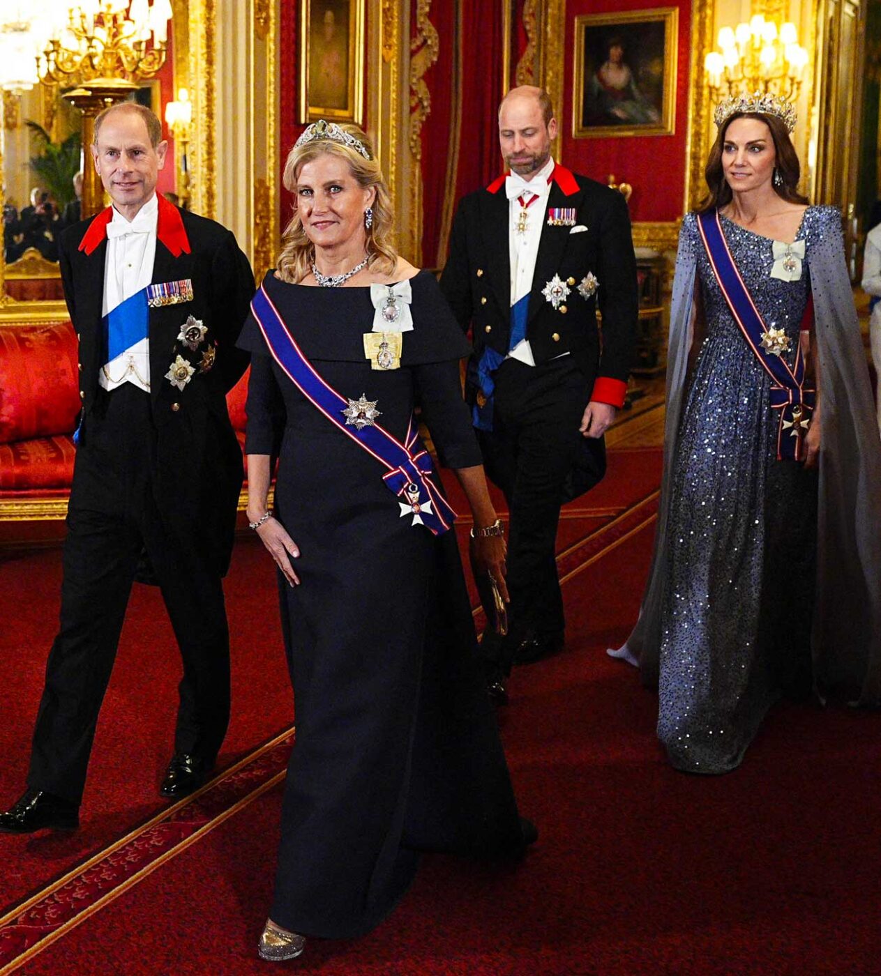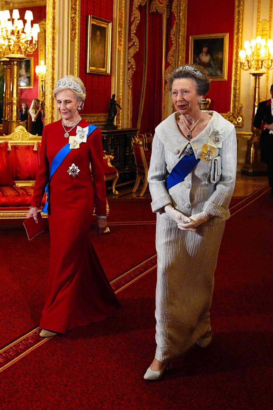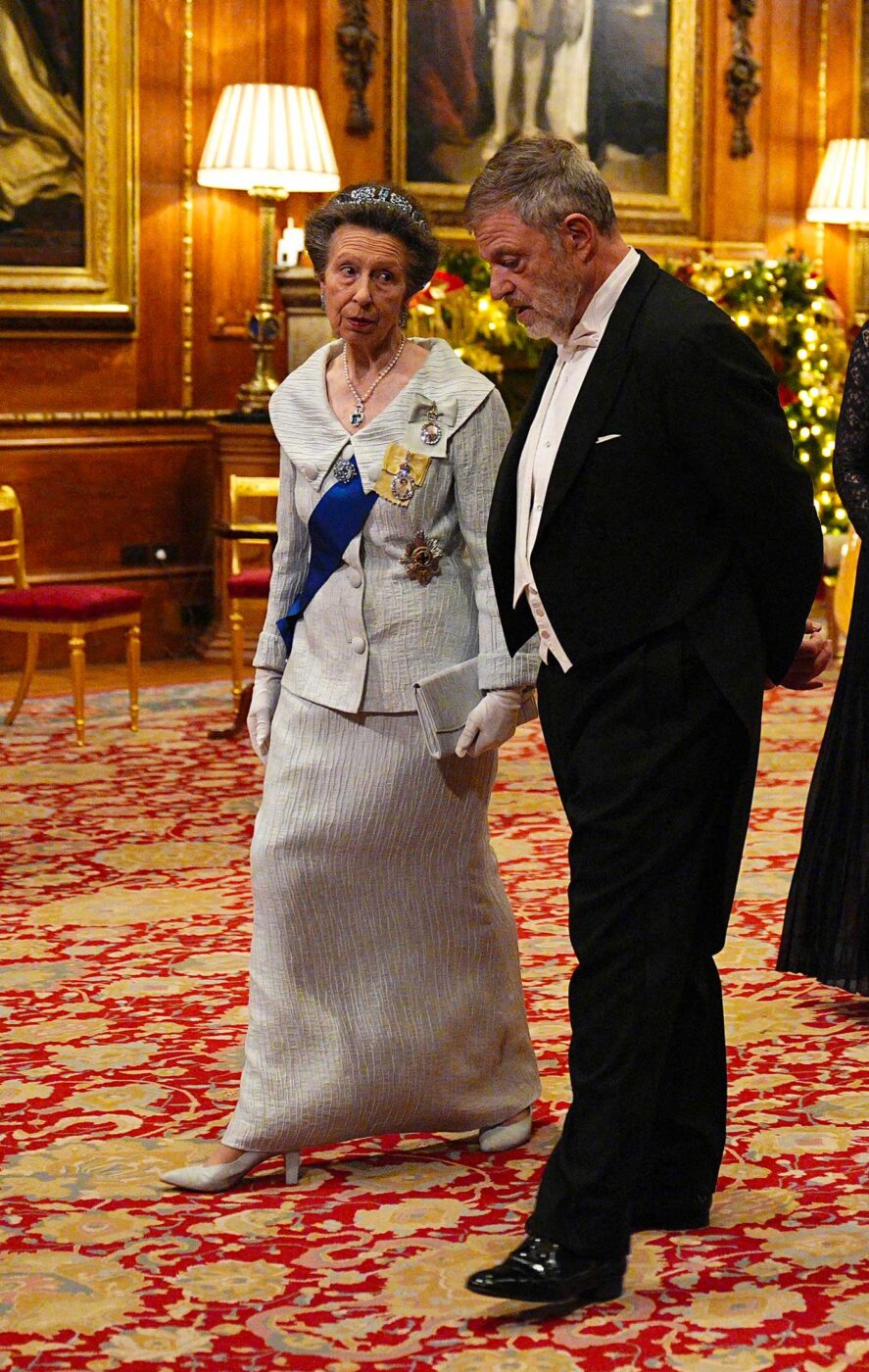 La princesse Anne, 75 ans, a assisté au banquet d’État avec son époux, Sir Timothy Laurence. La sœur du roi Charles III n’avait pas dérogé à son habitude de porter blanc lors de ce banquet. Elle portait le ruban bleu de l’ordre de la Jarretière et un diadème Cartier en aigue-marine. Ce diadème est un cadeau du roi George VI à son épouse Elizabeth, offert en 1948 à l’occasion de leurs 25 ans de mariage. Le diadème sera peu porté par Elizabeth et elle l’offrira à leur petite-fille, Anne, à l’occasion de son premier mariage, en 1973. Ce diadème appartient donc personnellement à la princesse Anne.