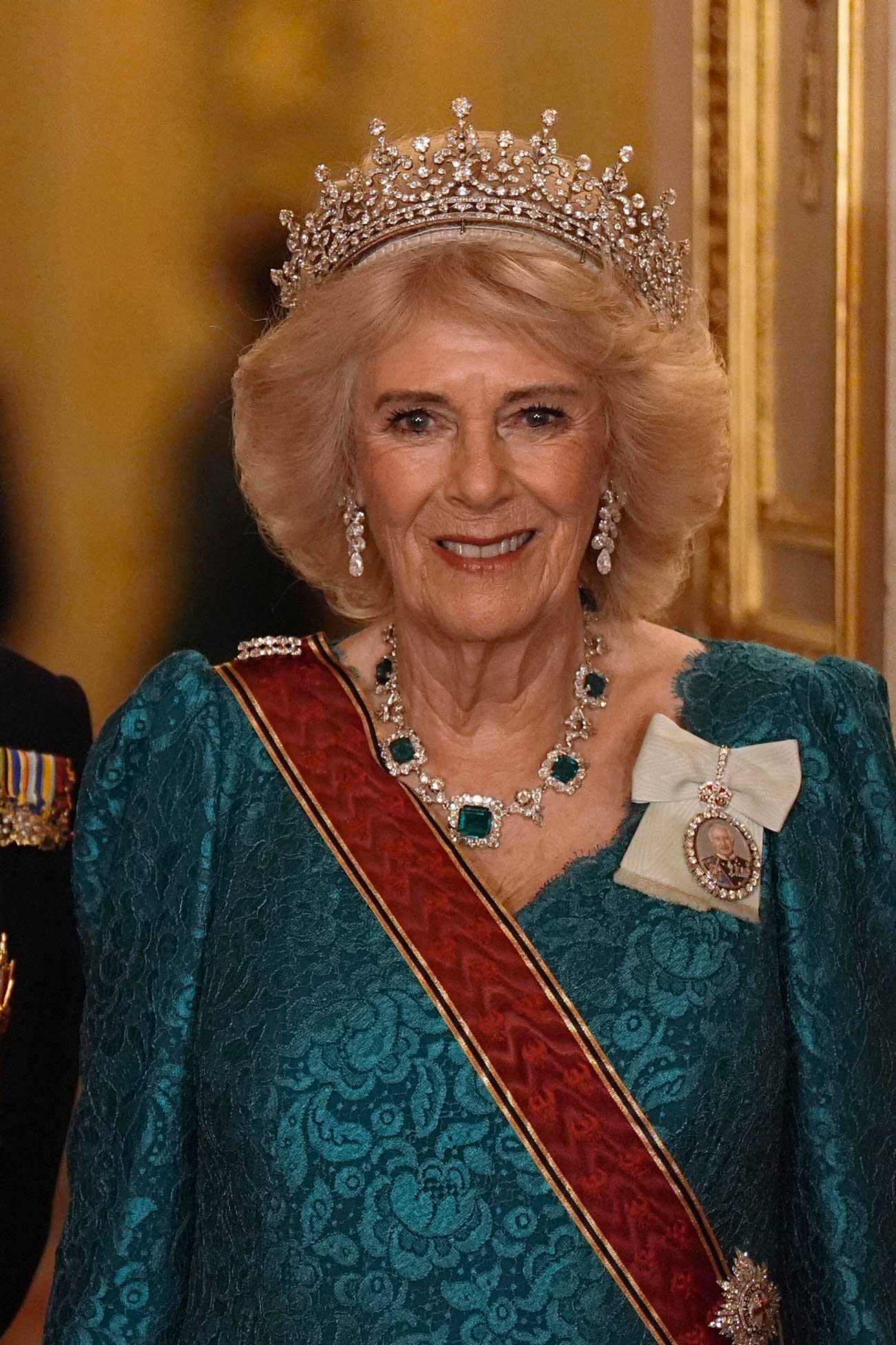 La reine Camilla porte le diadème Girls of Great Britain and Ireland, qui fut le diadème fétiche de la reine Elizabeth II, ainsi que le collier d’émeraudes Greville. Elle porte le ruban rouge bordé de noir et de jaune de l’ordre du Mérite de la république fédérale d’Allemagne (Photo : Aaron Chown/PA Wire/ABACAPRESS)