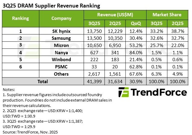 Etabli par Trendforce, ce tableau classe les principaux fournisseurs de DRAM du marché en fonction de leur chiffre d’affaires et de leurs parts de marché sur le troisième trimestre 2025. Micron arrive en troisième position