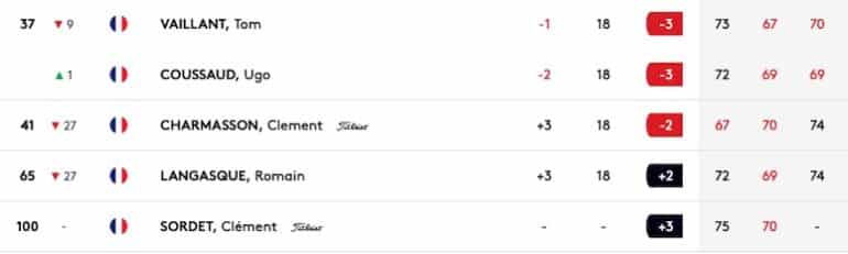 Même Clément Charmasson, pourtant bien parti dans le tournoi, a dégringolé à la 41e place après avoir concédé six bogeys (avant d’enregistrer un eagle et un birdie) et signé le même score. Clément Sordet avait raté le cut.