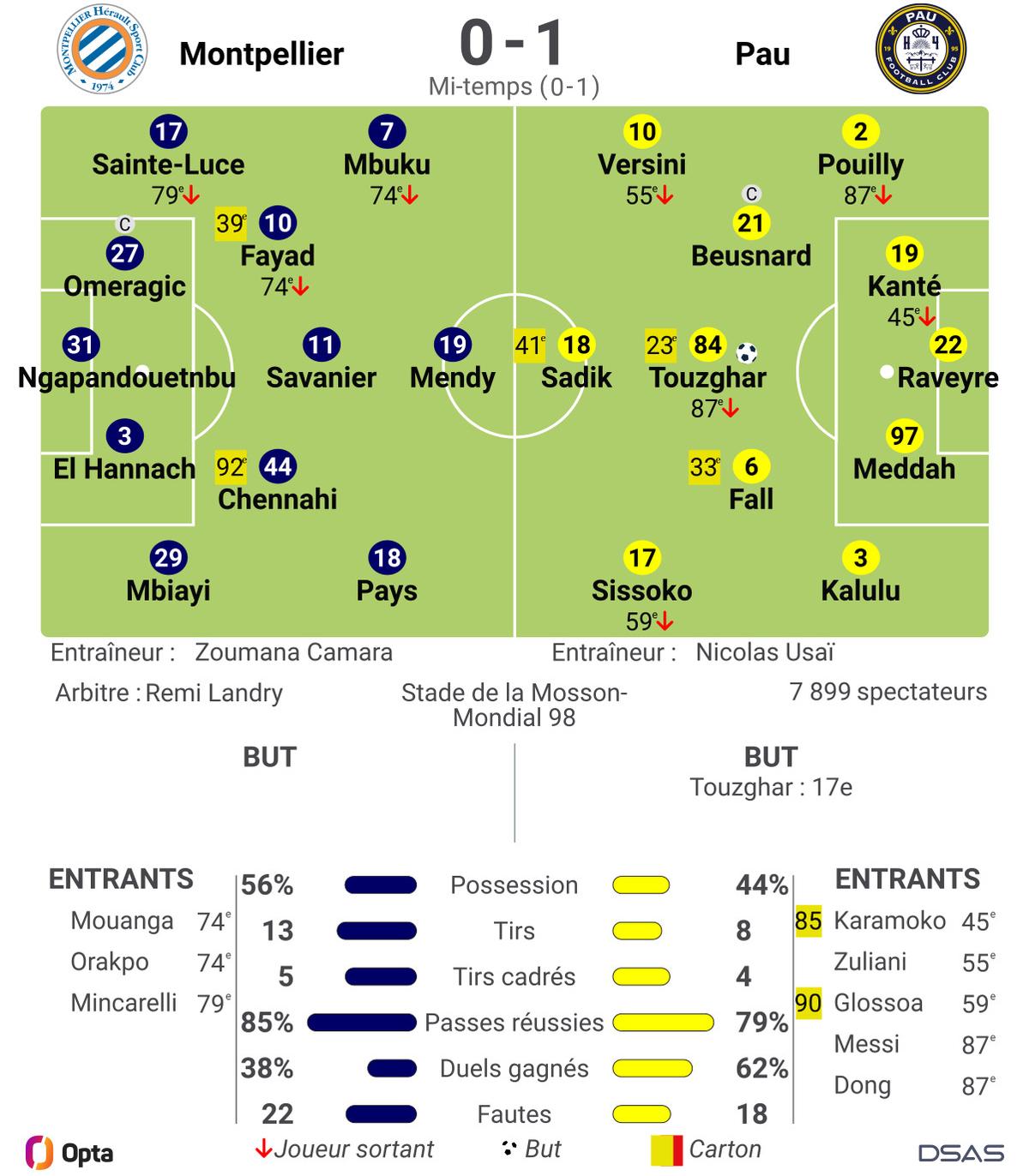 Usai tente alors de densifier son bloc avec l’entrée de Glossoa à la place d’un Versini diminué par un coup au mollet. La Mosson s’agace des décisions arbitrales, mais Pau ne parvient pas à tuer le match : Touzghar, lancé dans la surface, choisit la frappe au lieu d’offrir le ballon à Pouilly.