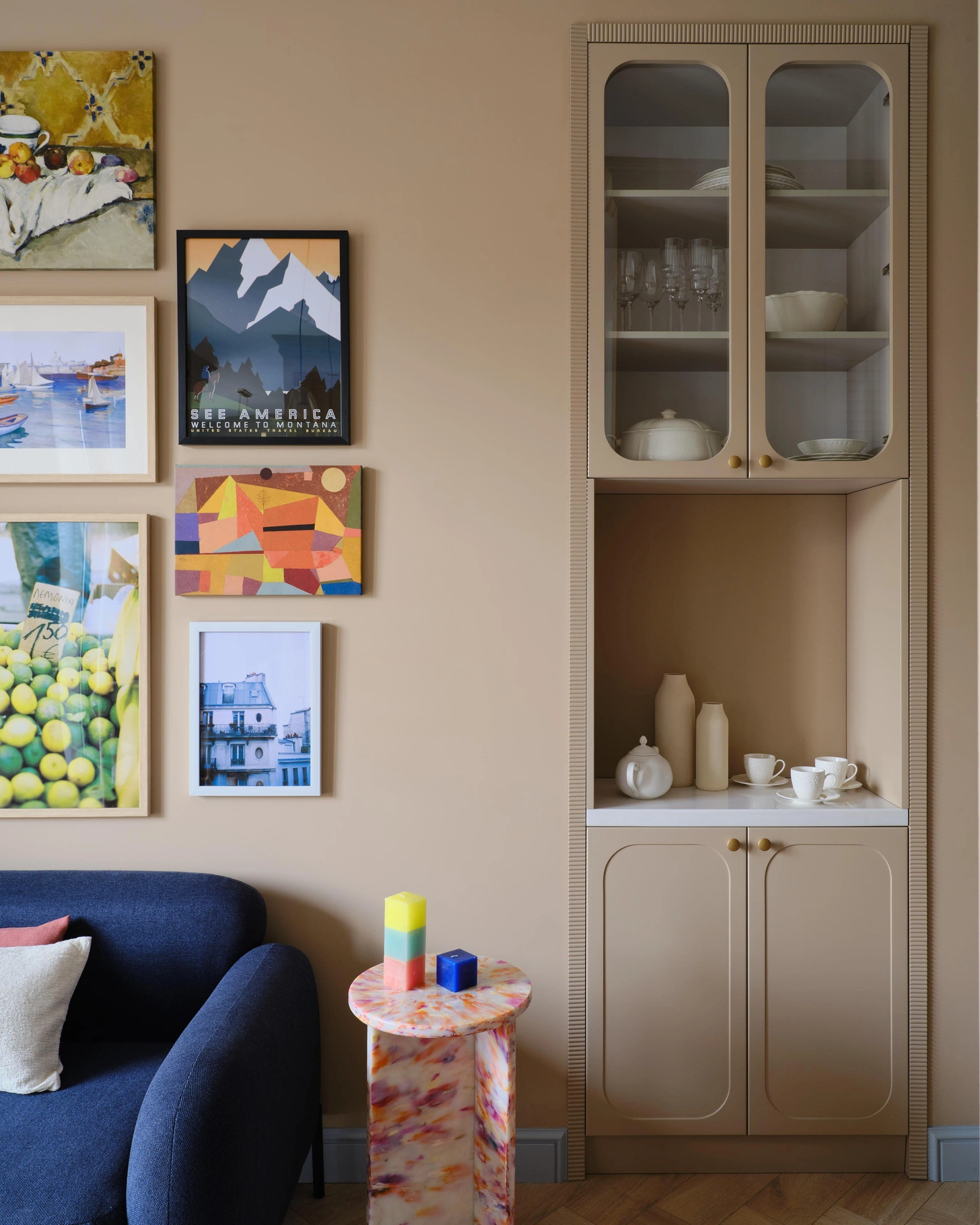In Kazakhstan, designer Gulnara Alimbayeva has created a personalised space for an owner who is allergic to overly conservative interiors in his 100m2 flat in Almaty. She has created a lively, colourful space with bespoke elements. The professional knows her client well, having met him at an informal meeting where their discussions quickly turned to travel and distant cultures. He dreamed of a warm apartment, far from overly neutral atmospheres. His wish was clear and straightforward: to find comforting energy at home after each business trip.
