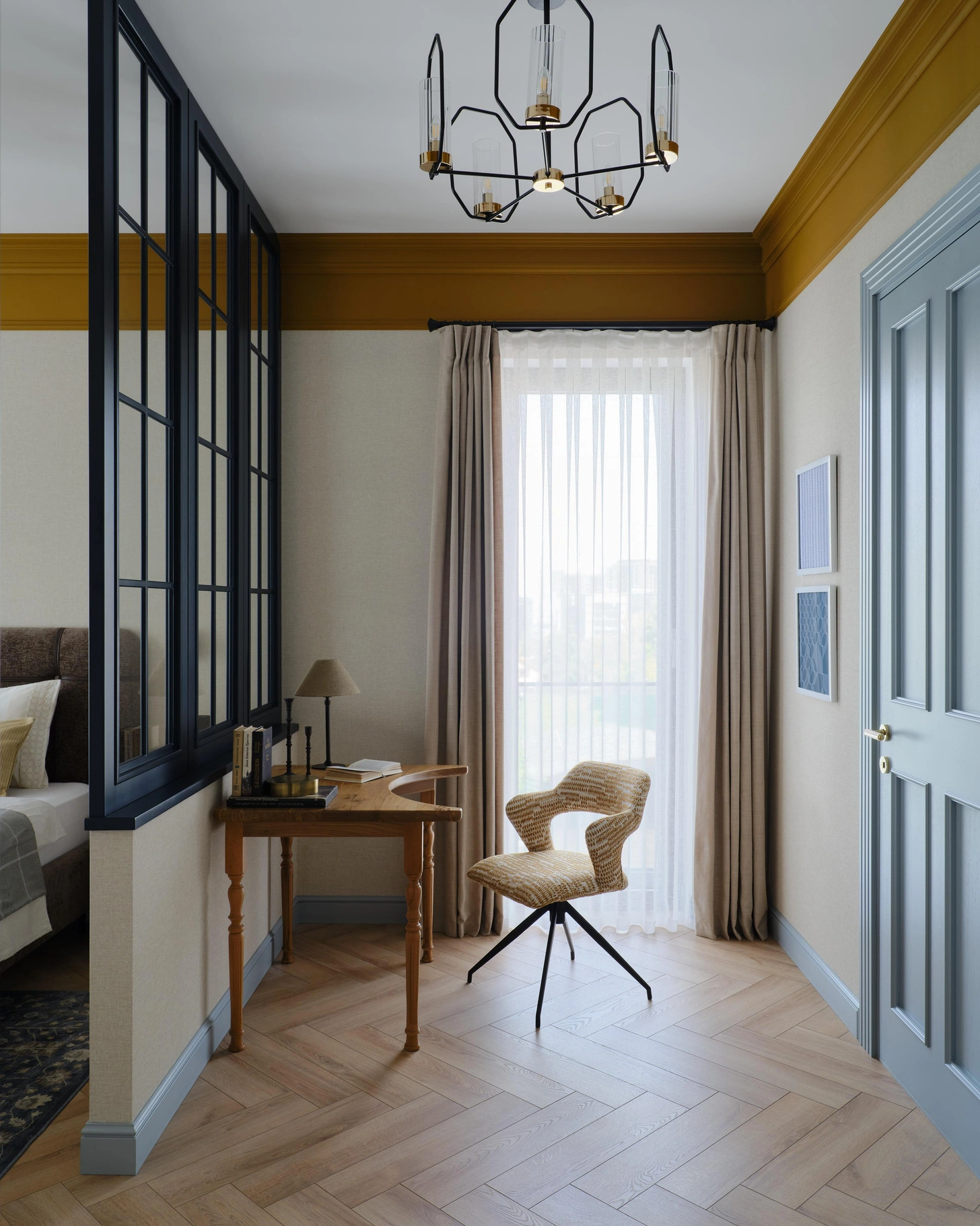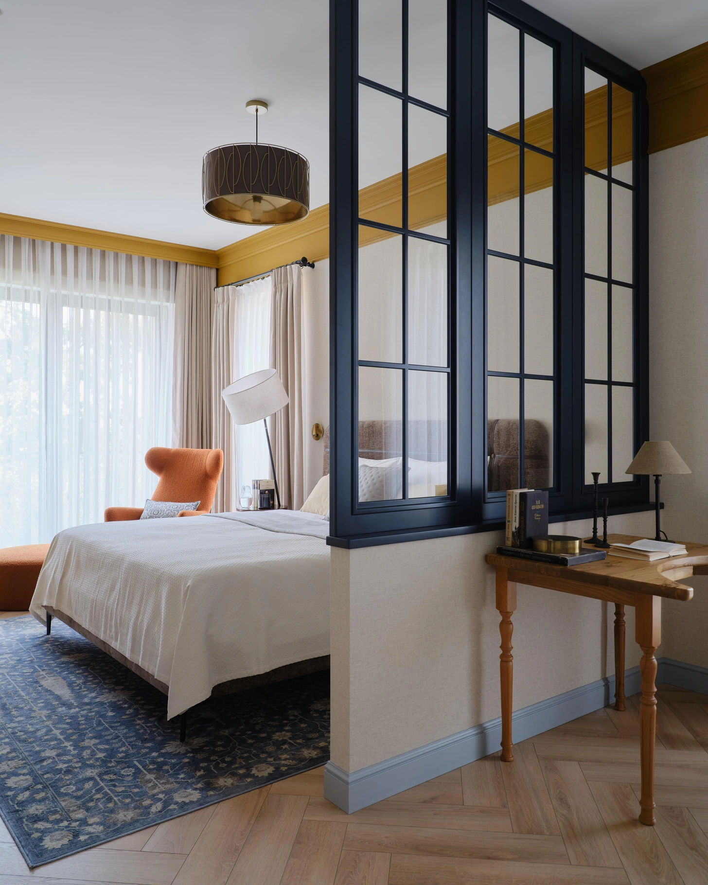 L’équipe a travaillé sur une vaste boîte en béton, lumineuse et dotée de colonnes porteuses et d’un potentiel certain. En sept mois, l’espace a été transformé dans à un style anglais revisité avec des couleurs profondes. La designer c’est également inspirées d’éléments régionaux. Les grandes baies vitrées apportent une lumière continue, tandis que la terrasse offre chaque soir un spectacle saisissant. Elle a dessiné la plupart des meubles, et certaines pièces ont été fabriquées dans un atelier local. Le résultat est à la fois original et artisanal. Dans cet appartement de 100m2 à Almaty, le zonage a aussi été repensé. On lui a ajouté notamment des cloisons vitrées comme dans la chambre qui intègre ainsi un bureau discret. Photo : Damir Otegen. Style : Aigerim Akhmetova