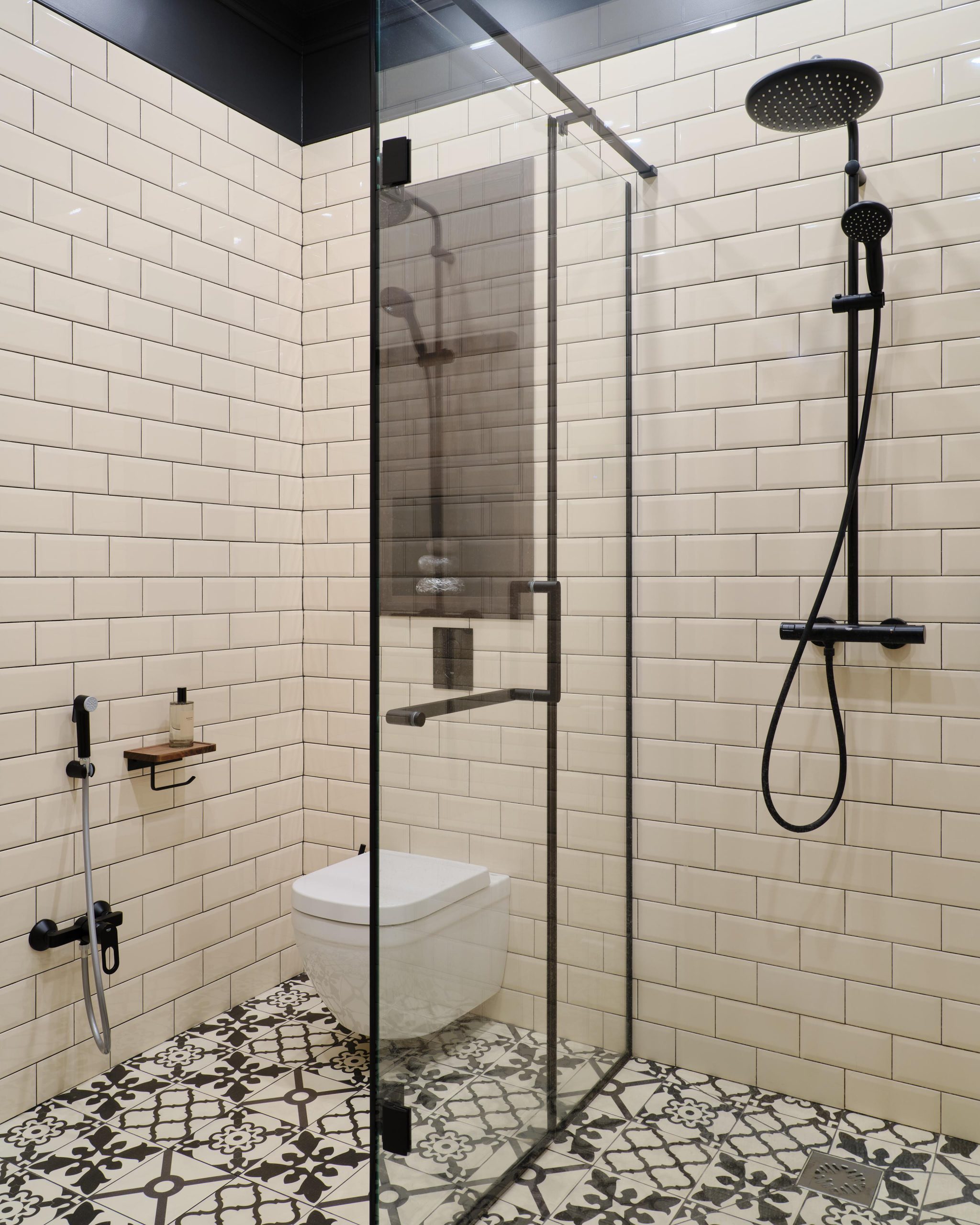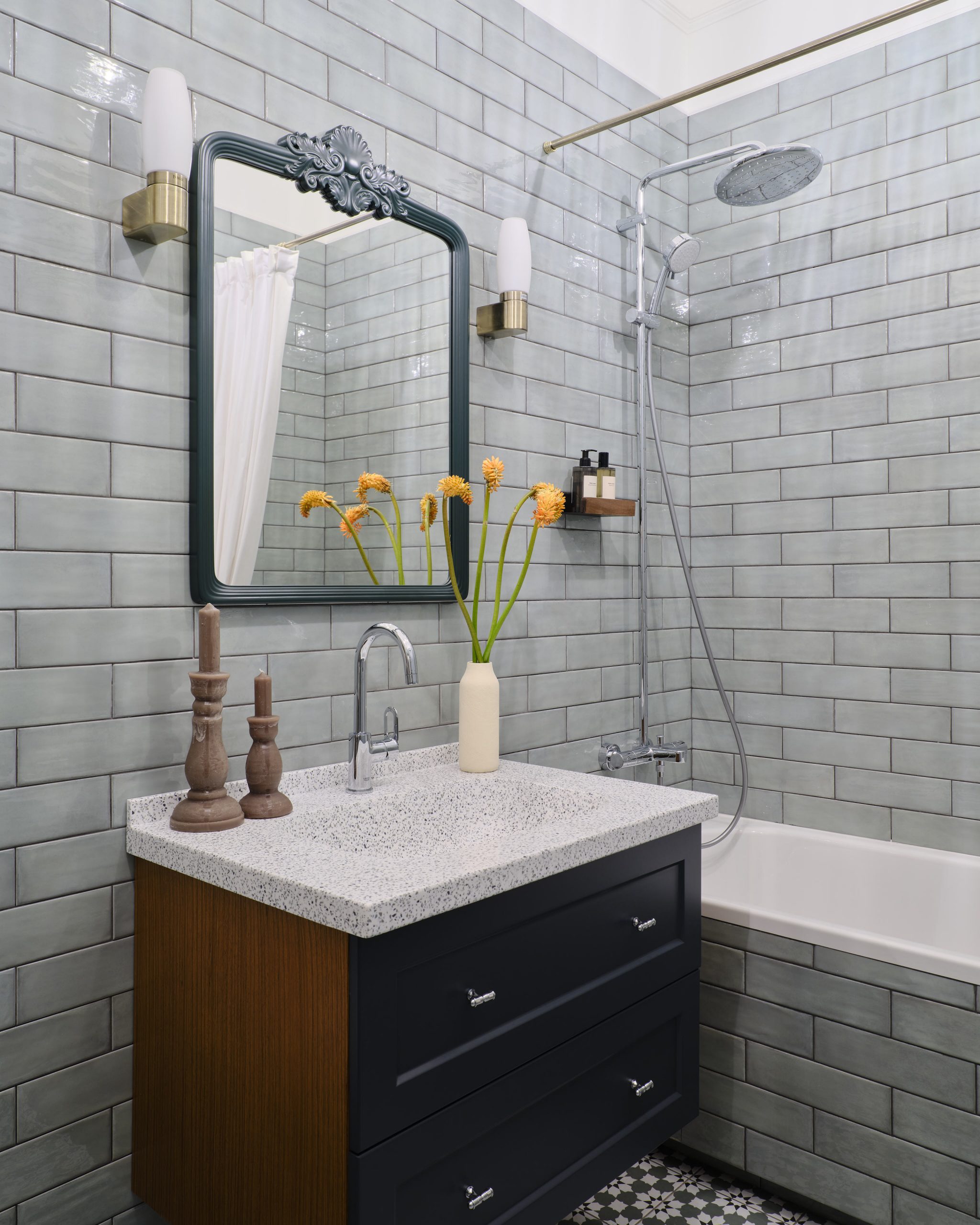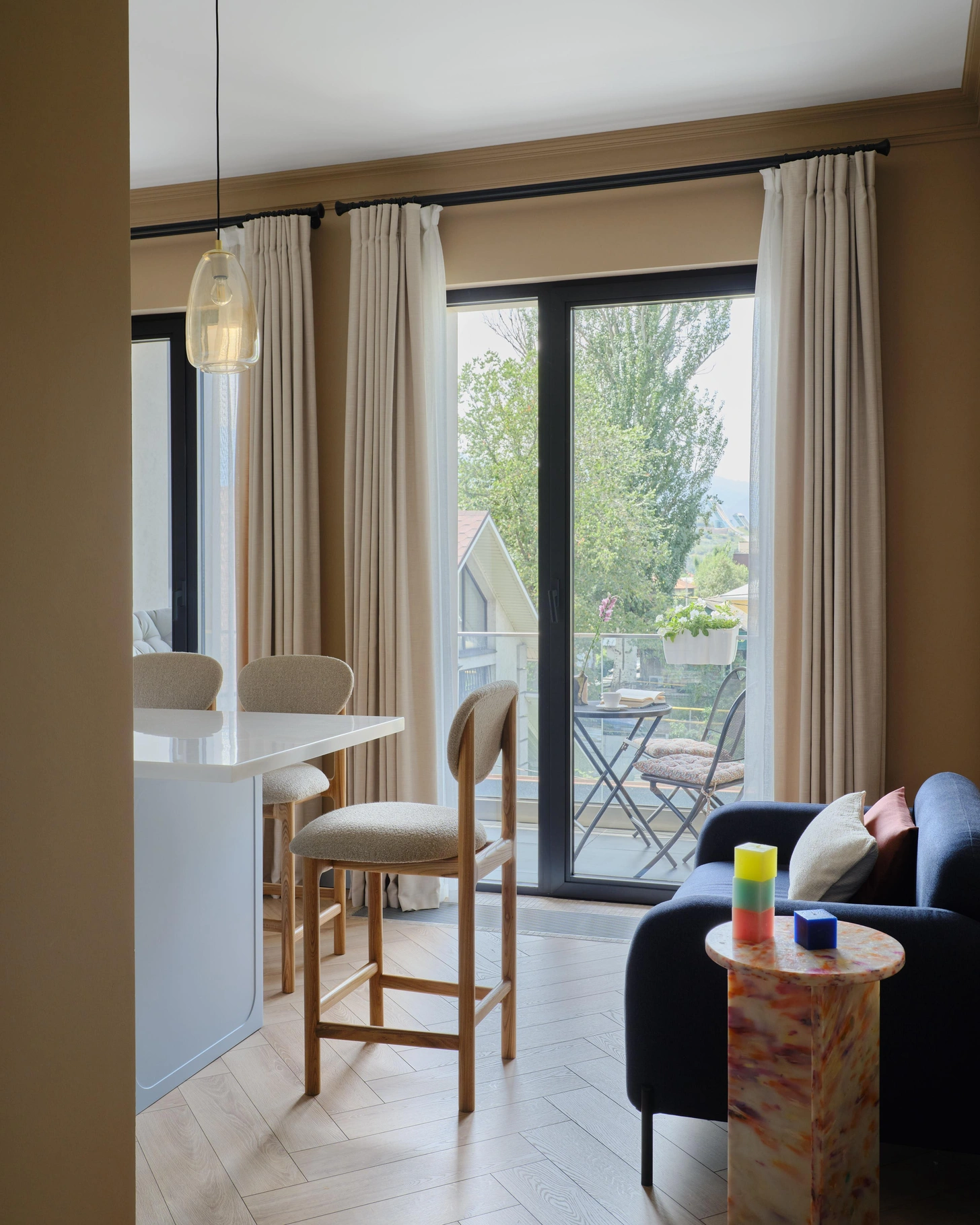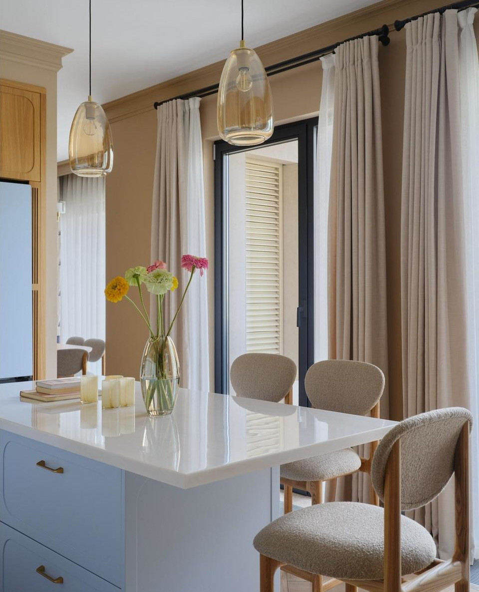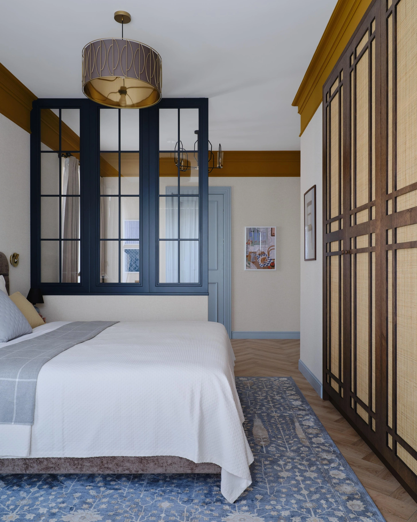 The team worked on a large, bright concrete box with load-bearing columns and definite potential. In seven months, the space was transformed into a revisited English style with deep colours. The designer also drew inspiration from regional elements. The large bay windows provide continuous light, while the terrace offers a breathtaking view every evening. She designed most of the furniture, and some pieces were made in a local workshop. The result is both original and artisanal. In this 100m2 flat in Almaty, the zoning has also been redesigned. Glass partitions have been added, such as in the bedroom, which now incorporates a discreet office. Photo: Damir Otegen. Style: Aigerim Akhmetova