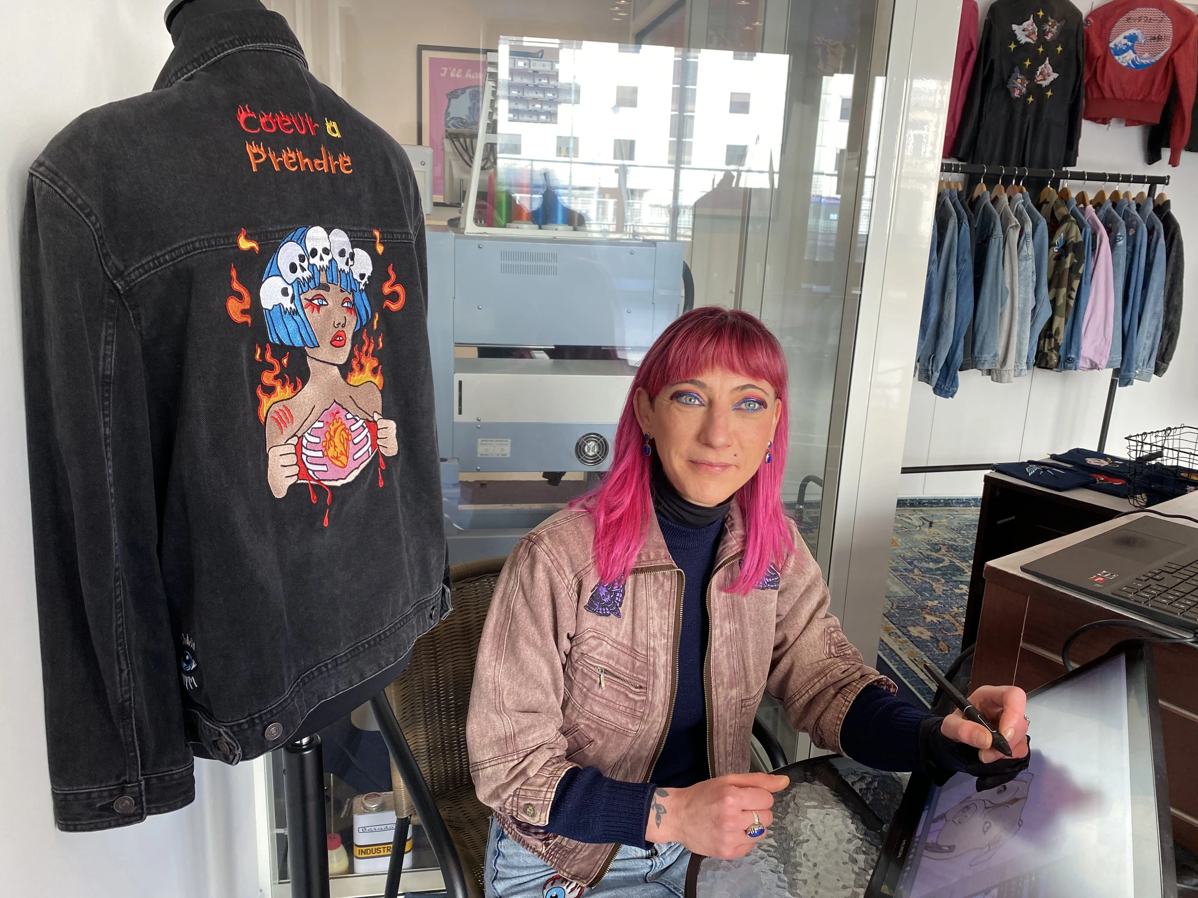 On l’aura compris, cette boutique va à l’encontre même de la fast-fashion. Cécile, qui accueille toutes ces créatrices, produit des nouveaux vêtements dans son atelier boutique, à partir de pièces qui existent déjà. Simplement, elle crée des motifs qui sont ensuite brodés sur le tissu.