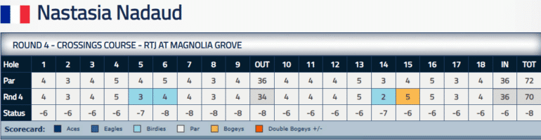 Une carte identique de 70 (-2) sur le Crossings Course de Magnolia Grove à Mobile (Alabama) ce mardi ont propulsé les Françaises Perrine Delacour et Nastasia Nadaud (photo) sur le LPGA Tour 2026. Elles terminent respectivement 3e (-11) et 10e (-8) de cette finale des Cartes réduite à 72 trous sans cut.